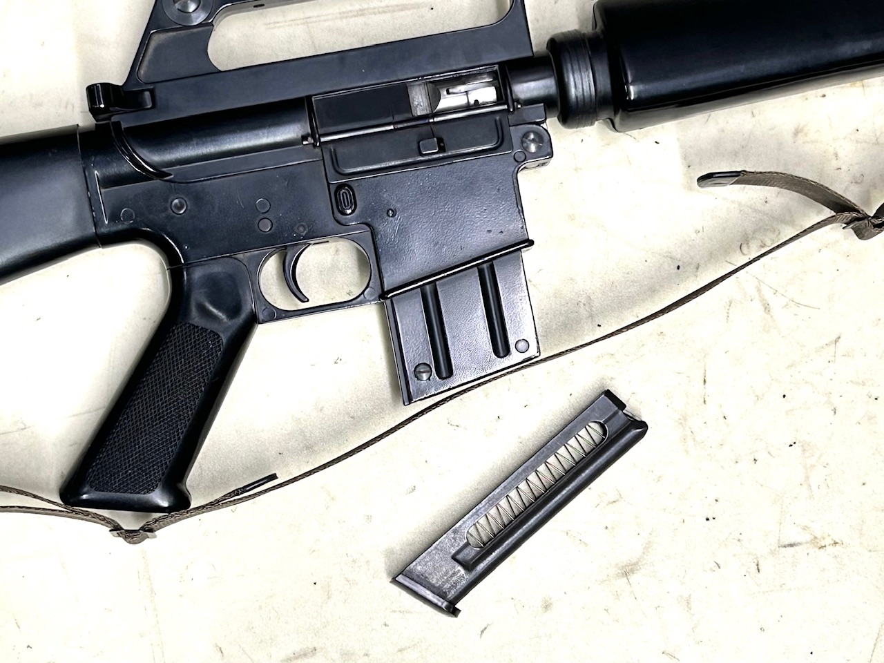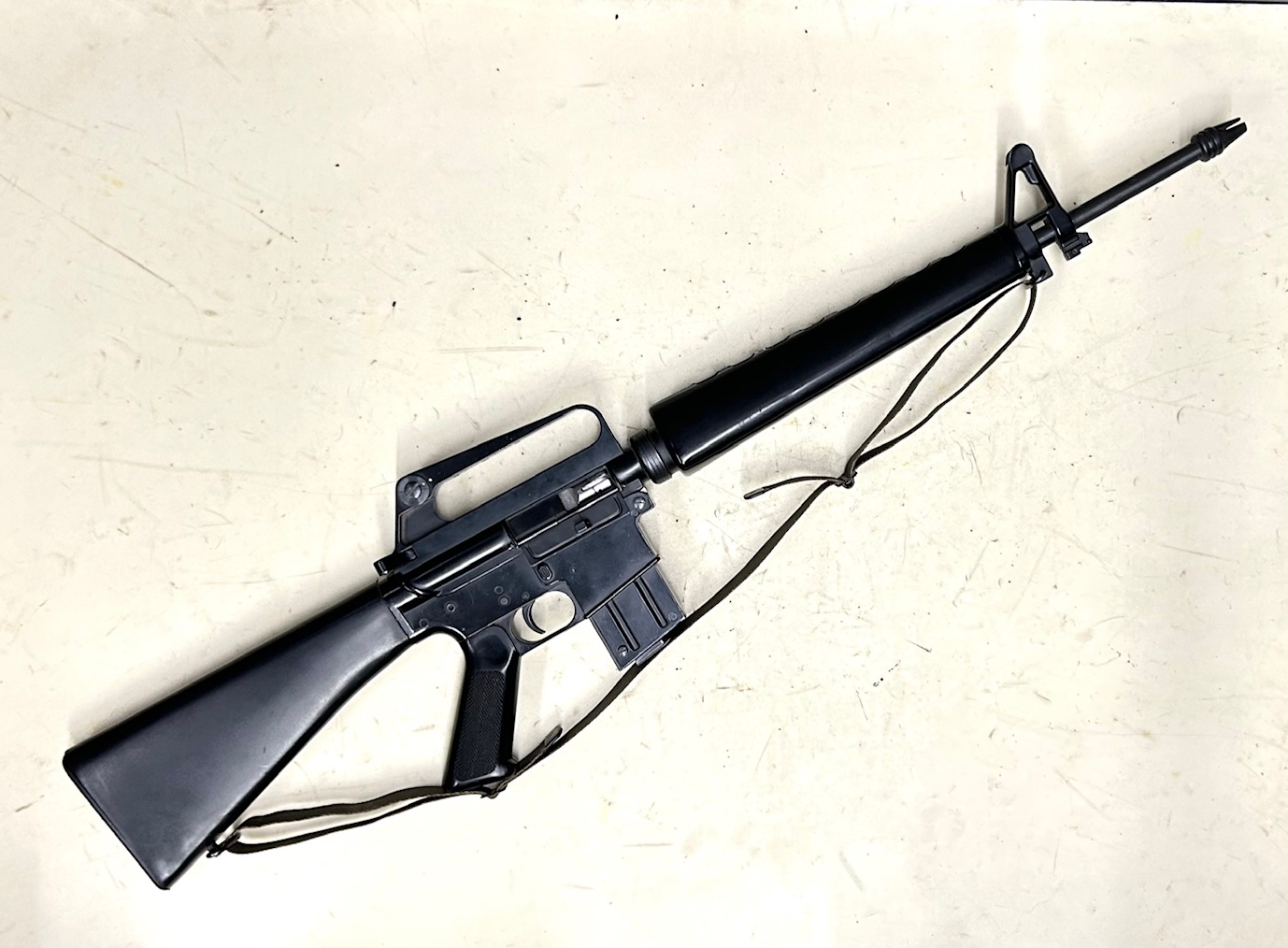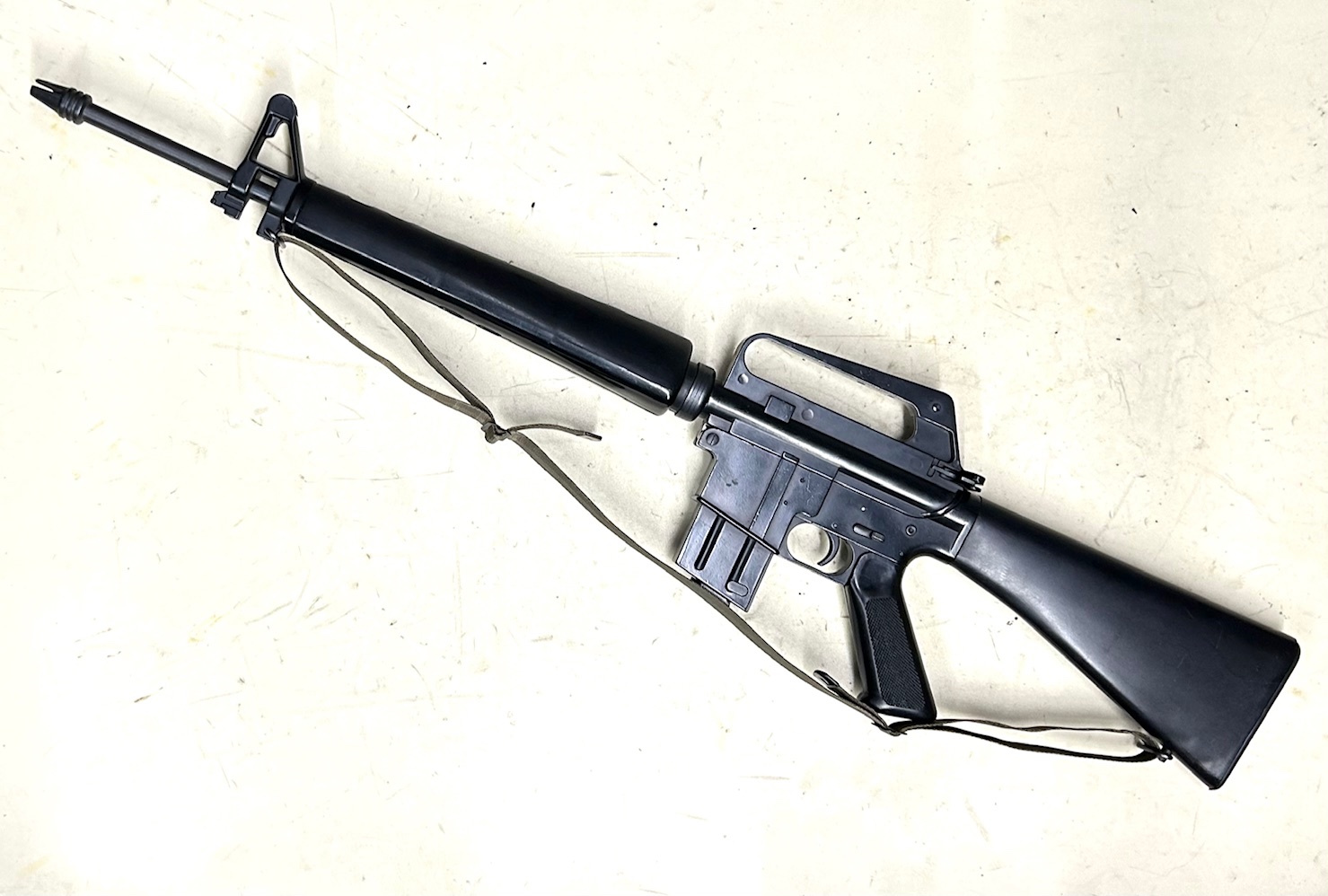 Versione per il tiro da addestramento e divertimento del fucile d’assalto dei militari USA nella guerra del Vietnam, realizzato dalla famosa “Armi JAGER” di Piscetta in Loano (SV); riprodotto fedelmente in ogni particolare estetico, come il caricatore da 10 colpi che si inserisce all’interno di un finto caricatore delle stesse dimensioni dell’originale, fu esportato come trainer militare negli anni 80 in Malesia, il cui esercito aveva adottato il Colt AR15-M16 in 5,56 . Condizioni eccellenti, canna specchio, uno dei primi prodotti (matricola a 2 cifre)