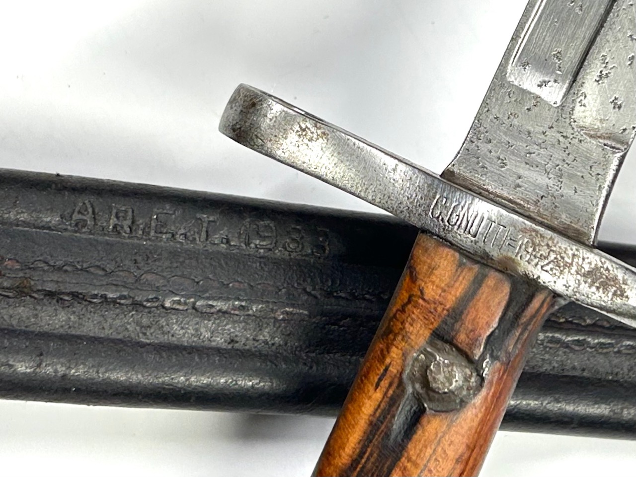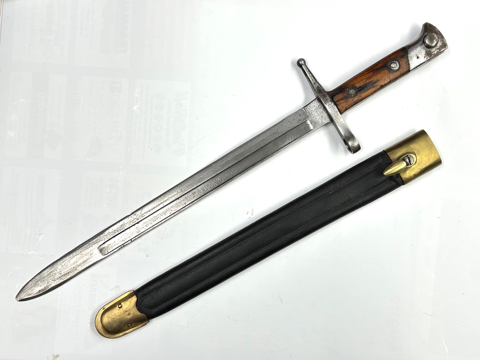 “Sciabola-Baionetta per Fucile lungo 1891/41”, marcata dal fabbricante “GNUTTI – 1942” sull’elsa, completa di fodero in cuoio marcato A.R.E.T. 1933; Eccellenti condizioni generali, fodero integro