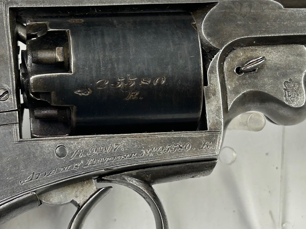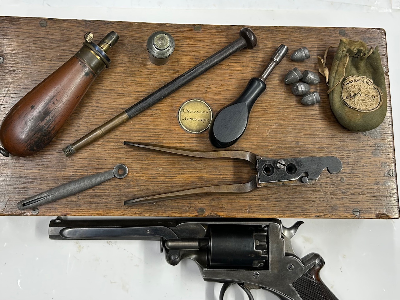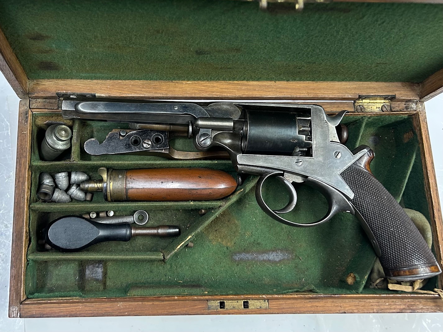 Raro revolver avancarica con incisione del distributore irlandese e completo della sua cassetta; eccellenti condizioni originali di finitura, guancette intonse, meccanica e canna ottime; sul castello la scritta “ADAM’S PATENT” più la doppia matricola, quella del produttore L.A.C. seguita dalla lettera “R” e una matricola addizionale con prefisso “B”,  utilizzata  per il controllo del pagamento dei diritti sul brevetto a F. Beaumont (che permette tra l’altro di datare l’arma come ante  febbraio 1862, data di scadenza del brevetto); presenti inoltre il monogramma L.A.C. coronato del produttore London Armory Company, i banchi inglesi sulla canna che riporta sulla parte alta l’incisione dell’indirizzo del distributore “TRULOCK & HARRIS, 9 Dawson Str. DUBLIN” e sul fianco la dedica “A.HEYLAND ARTILLERY” che è incisa anche sul medaglione dorato che adorna il coperchio della bellissima cassetta in legno di quercia inglese completo di tutti gli accessori, tra cui attrezzo di smontaggio dei luminelli, fondipalle, bacchetta, fiasca, palle, e la confezione originale di inneschi consistente in un sacchetto di tessuto verde con laccetti ed etichetta in carta riportante “WATERPROOF PISTOL CAPS – ELEY BRO. – LONDON“.