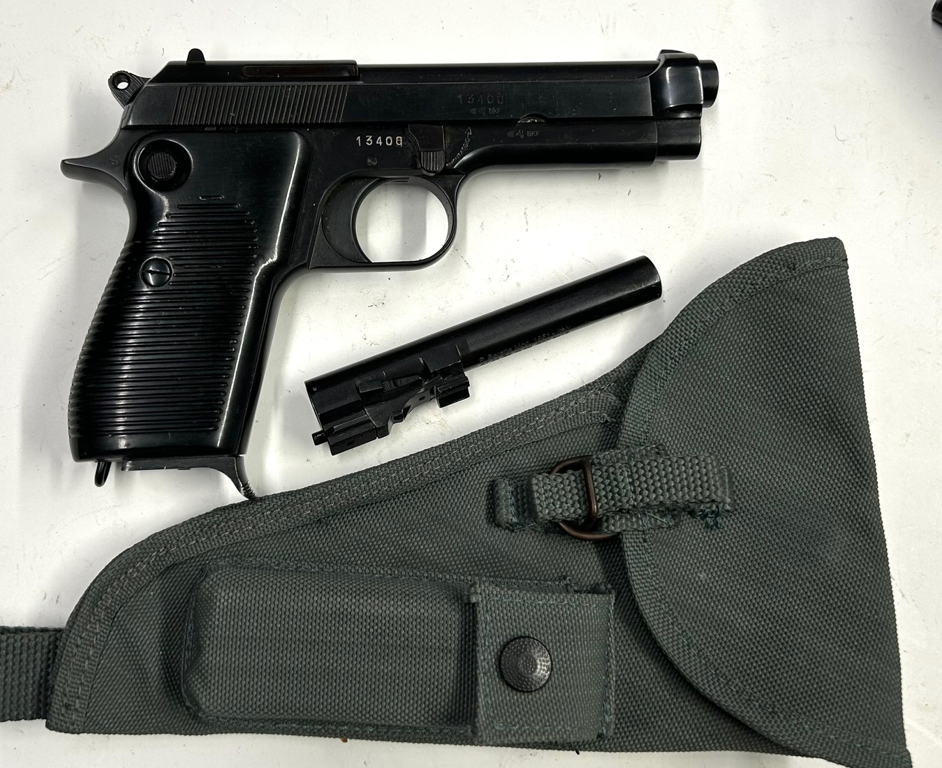 Rara 51 ex ordinanza Polizia di Stato anni 60, nuova d’arsenale e completa di due canne e fondina originale per uniforme da Ordine Pubblico dell’epoca.  Scritte primo tipo sul carrello “BERETTA – CAL. 9mm MOD. 1951 – PATENT“, presenta sul fusto il punzone dell’arsenale militare (la polizia era corpo militare fino al 1981) e  il marchio “PS” (Pubblica Sicurezza) in un cerchio.  Ricondizionata in arsenale,  la canna originale monomatricola era stata portata al calibro 9×21 per la normativa pre-’22, e viene fornita con una 2^ canna originale Beretta in calibro 9 mm Para proveniente da scorte ricambi militari. Tutto il lotto in condizioni pari al nuovo.