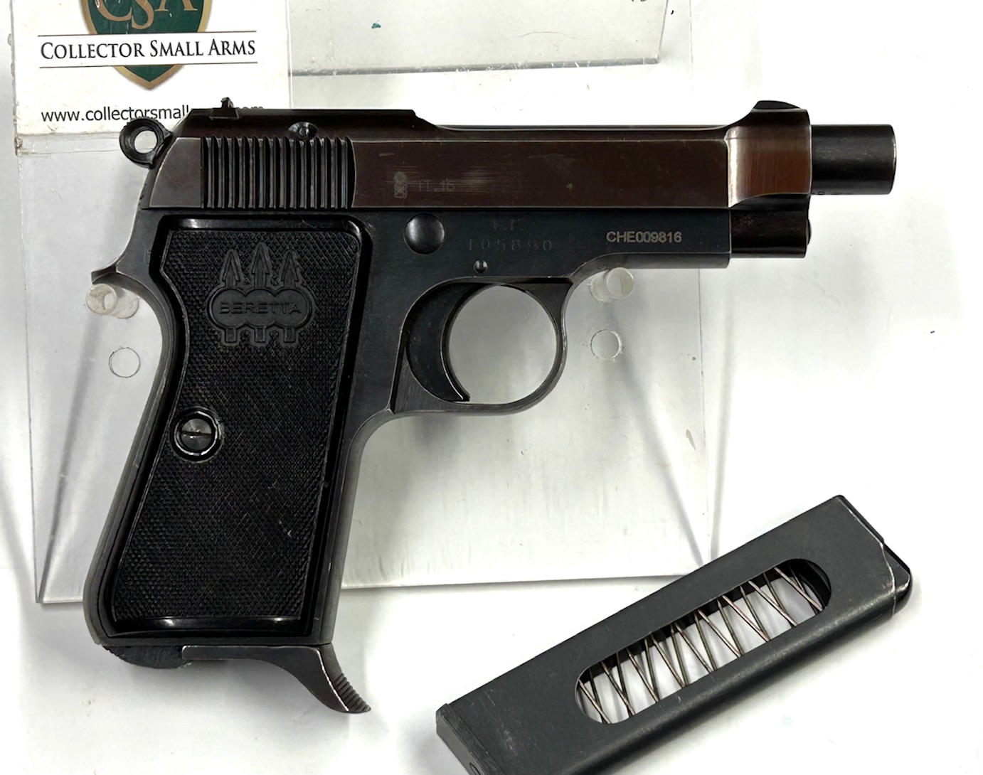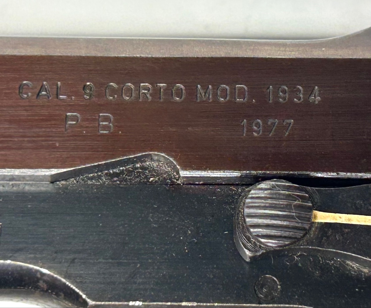 Produzione fine anni 70 per la Guardia di Finanza che richiese alcune specifiche modifiche al mod. 34 standard: canna più lunga di circa 1 cm, scatto ridotto a 1,5 Kg. e le cifre “G.F.” sopra la matricola. Il range matricolare dedicato dalla Beretta per questo contratto ha il prefisso T0xxxx, e si conoscono due varianti; questo è il 2^ tipo con guancette lunghe e prive dell’anello correggiolo. Doppio caricatore originale, condizioni eccellenti di brunitura originale, canna bella, meccanica perfetta