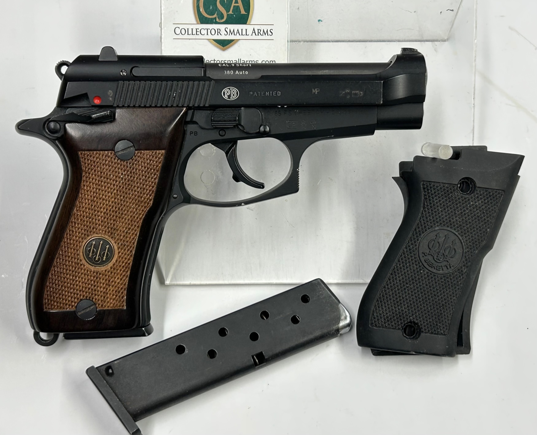 Ex ordinanza Ufficiali Carabinieri, versione monifilare della più comune 85, secondo caricatore, condizioni pari al nuovo, canna specchio, punzone “MP” dell’ispettore militare, con 2^ guancette in legno di noce originali con medaglione