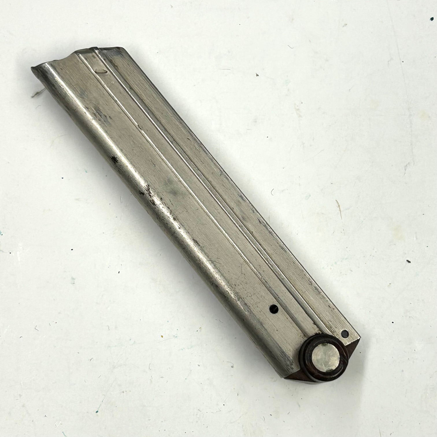Originale dotazione delle Luger militari modelli 1900 e 1906 dell’esercito svizzero, che richiese alla D.W.M. il fondello con dischetti di rinforzo in alluminio . Condizioni eccellenti con nickelatura al 90% e fondello integro