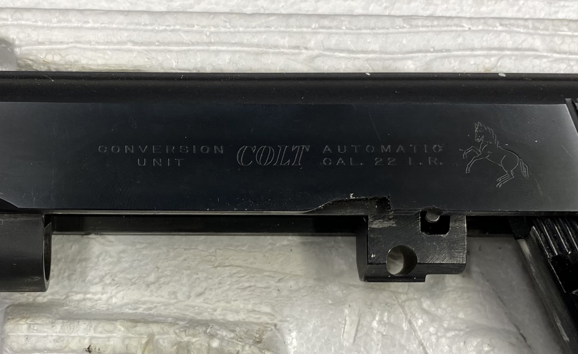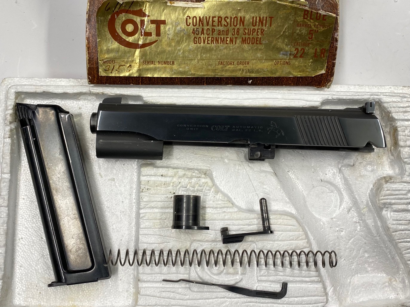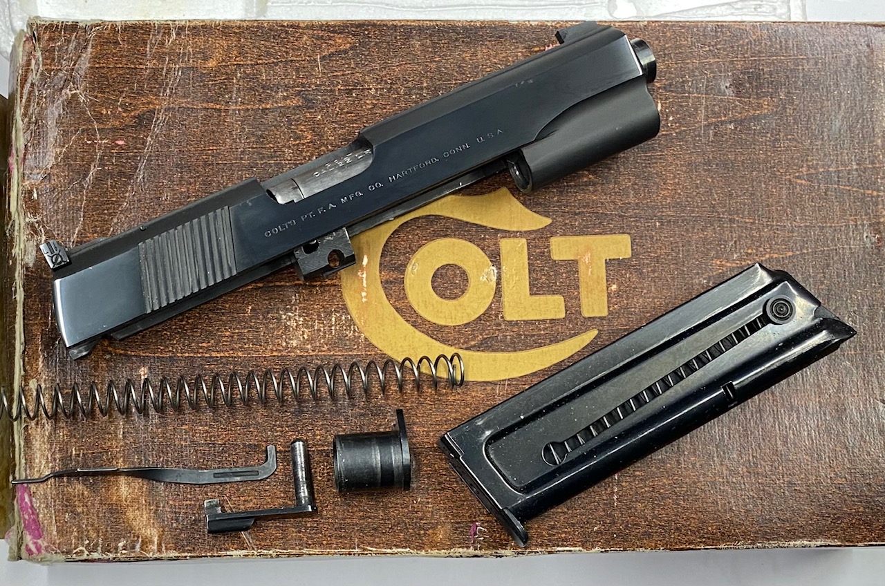 Kit conversione 22 LR originale COLT anni 70, utilizzabile su tutte le .45, ha una camera flottante per simulare il rinculo del .45 (brevetto della casa di Hartford per le forniture all’esercito U.SA.). Scritte pre 70, condizioni eccellenti di brunitura “Royal Blue” originale, canna specchio, in scatola originale Colt. Il kit è composto da canna, carrello, caricatore, espulsore, molla di recupero e guidamolla.
