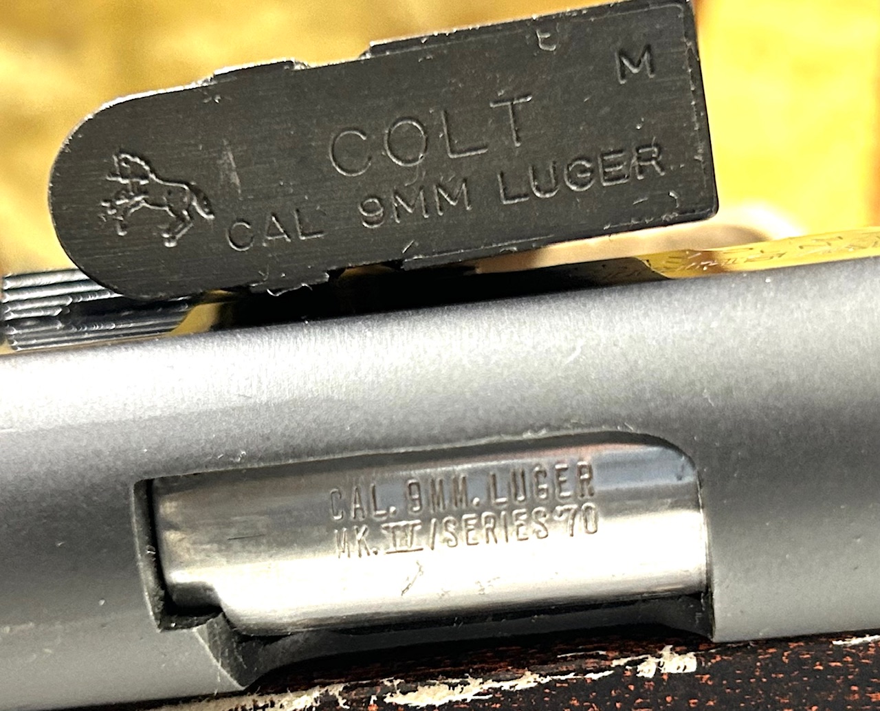 Anno 1982, finitura Royal Blue Colt in condizioni stupende (unico neo il segno lasciato dalla leva hold open a seguito di rimontaggio “inesperto”), carrello con scritte ultimo tipo “COLT’S MKIV/SERIES’70 – GOVERNMENT MODEL – 9 mm LUGER CALIBER“, meccanica perfetta, canna originale a specchio marcata “CAL. 9MM.LUGER – MKIV SERIES’70“, guancette checkered wood con medaglione Colt dorato, caricatore originale marcato, manuale originale e scatola (non stessa matricola). Una delle ultime prodotte prima dell’introduzione della Serie ’80