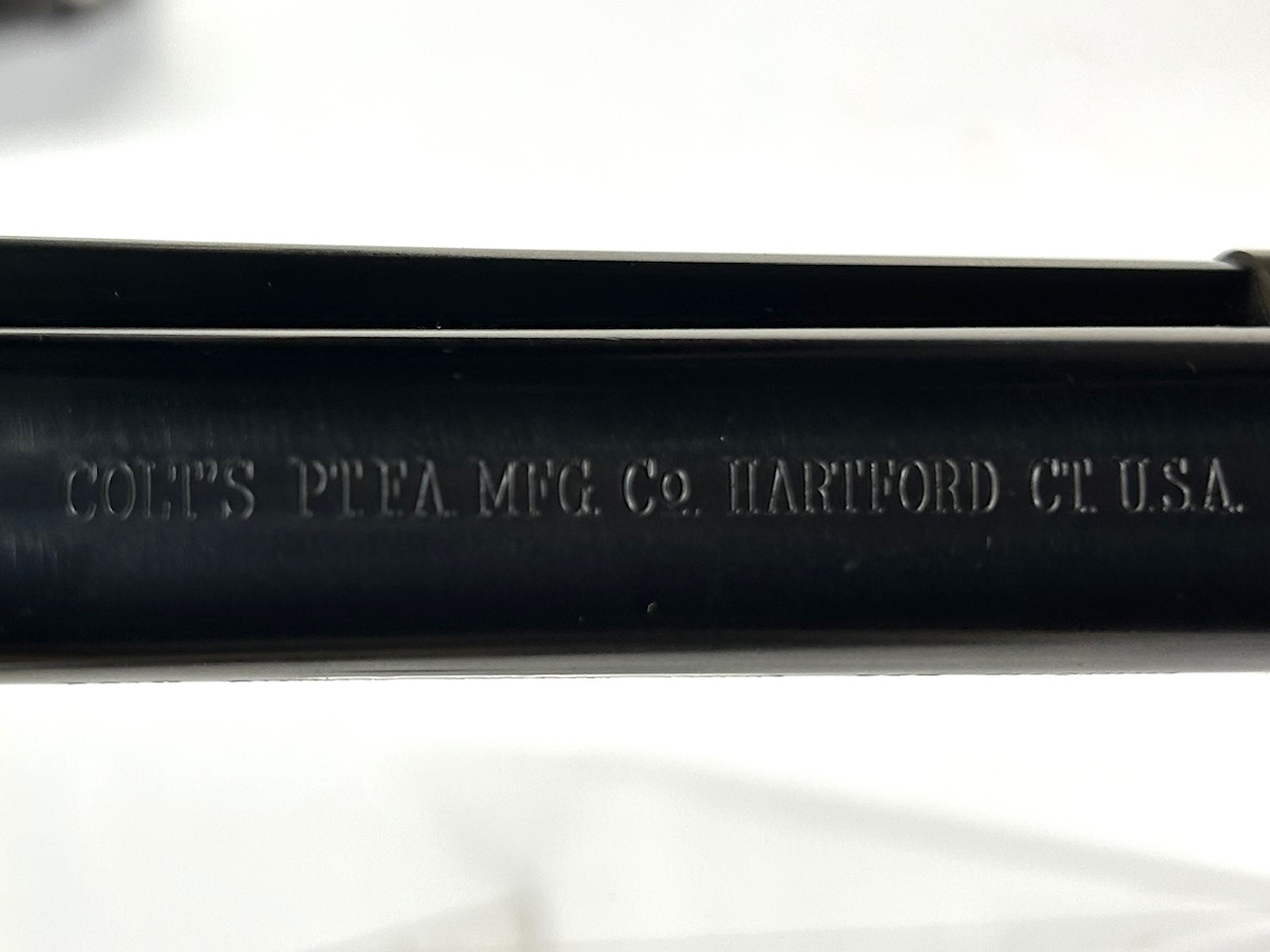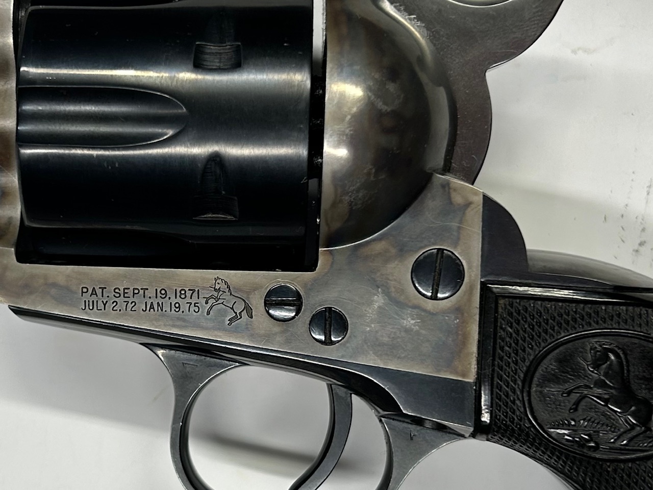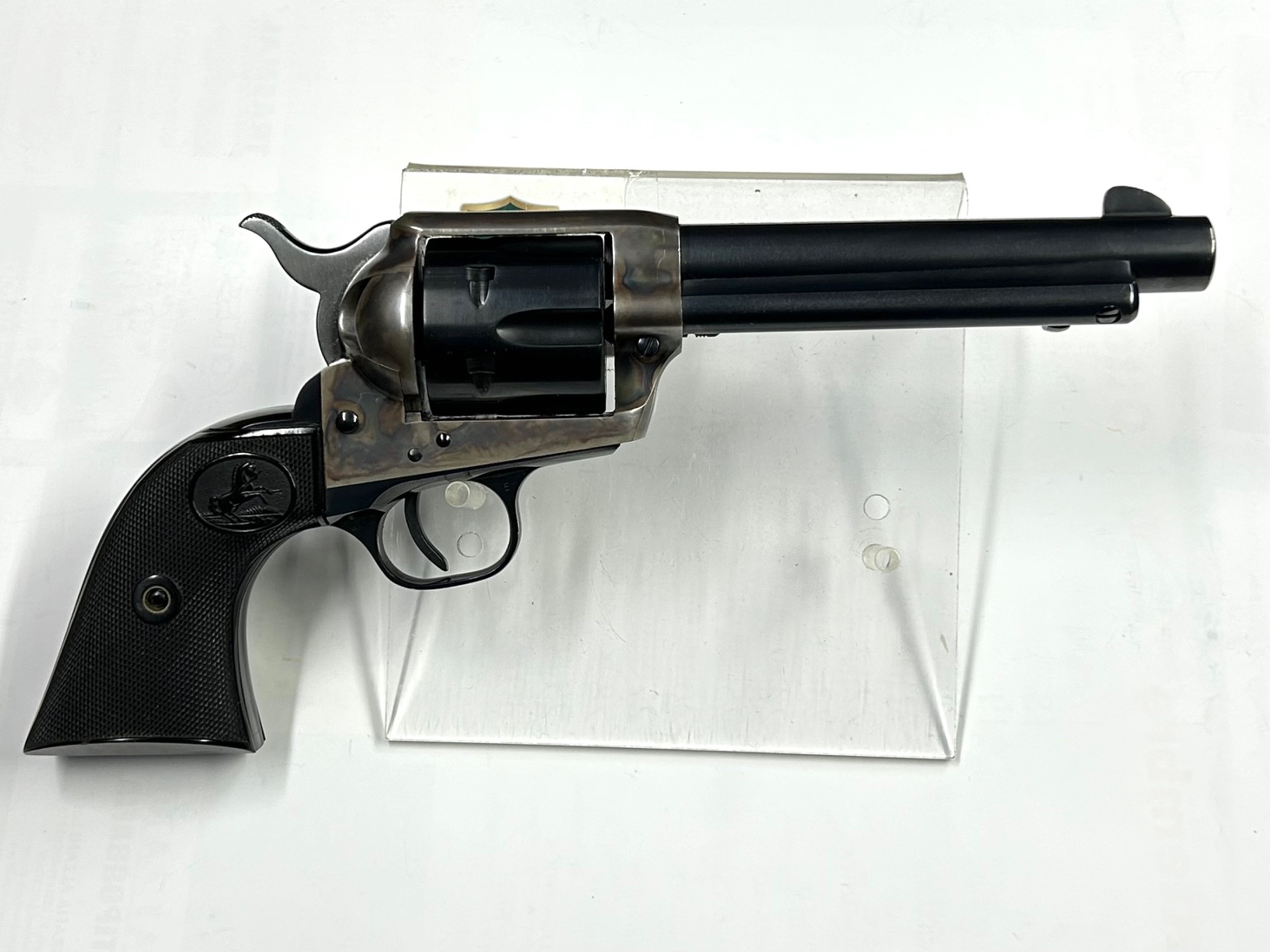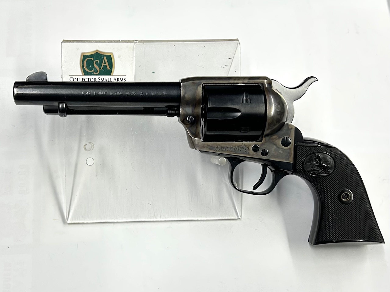 Anno 1961, Single Action Army originale COLT di seconda generazione, canna 5 pollici e 1/2, pochi pezzi prodotti in questo calibro, finitura e scritte 2nd Gen., royal blue in condizioni eccellenti, castello tartarugato , leggerissimi segni di utilizzo sul tamburo, canna perfetta, guancette originali intonse. Marcata sulla canna “COLT’S PT F.A. MFG. CO. HARTFORD CT. U.S.A.” e “COLT SINGLE ACTION ARMY .357 MAGNUM“, sul fusto i brevetti e il logo del cavallino rampante.