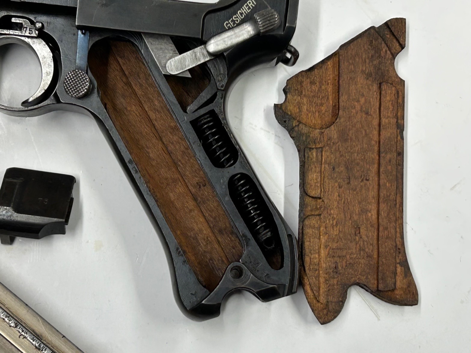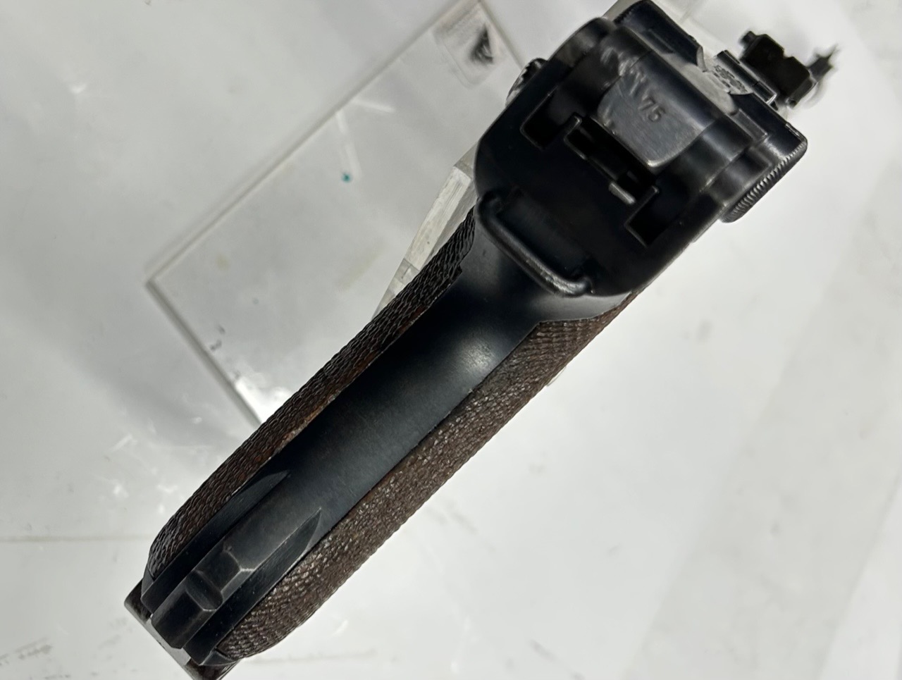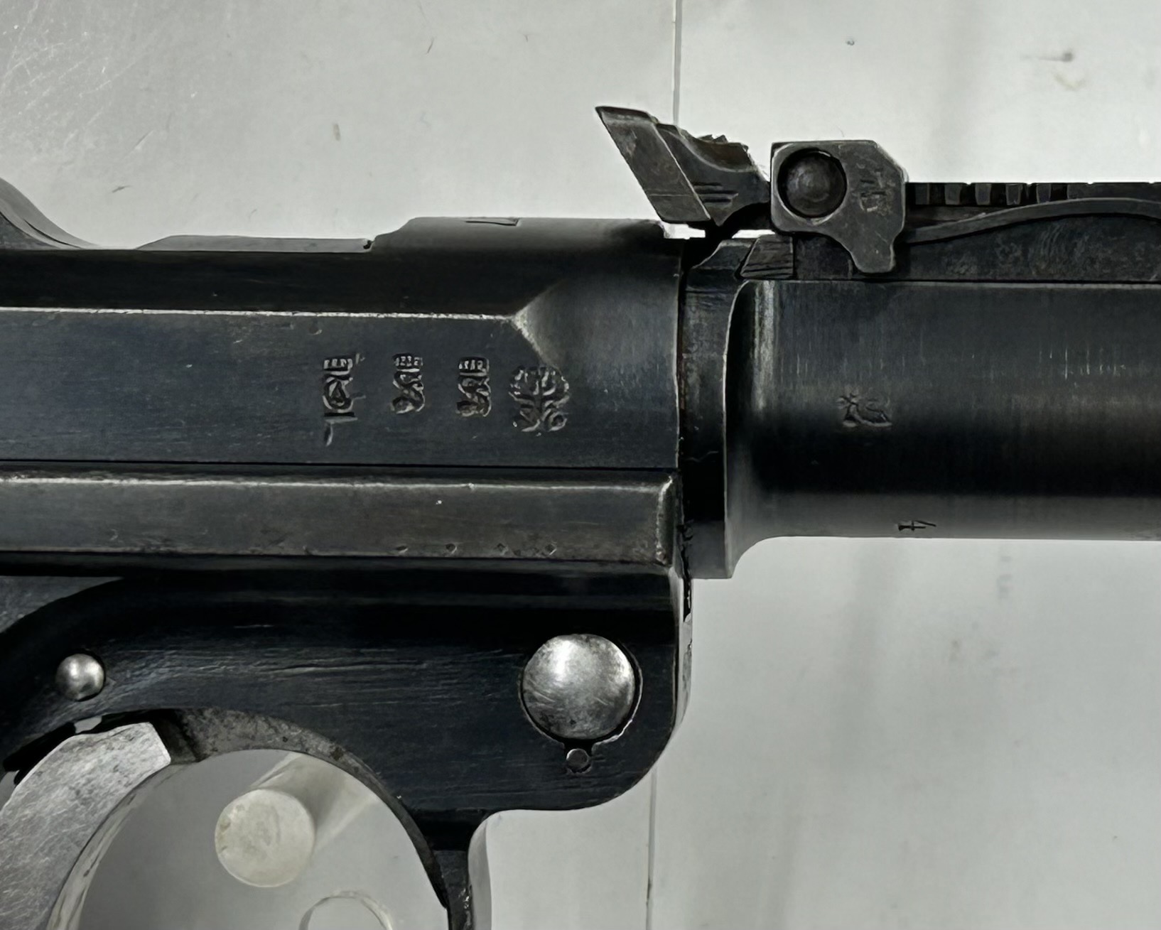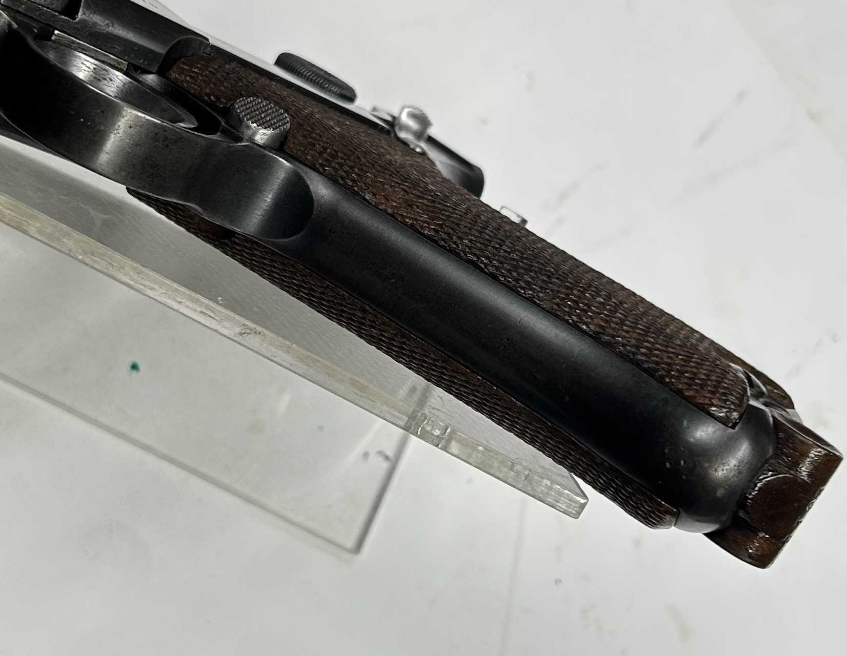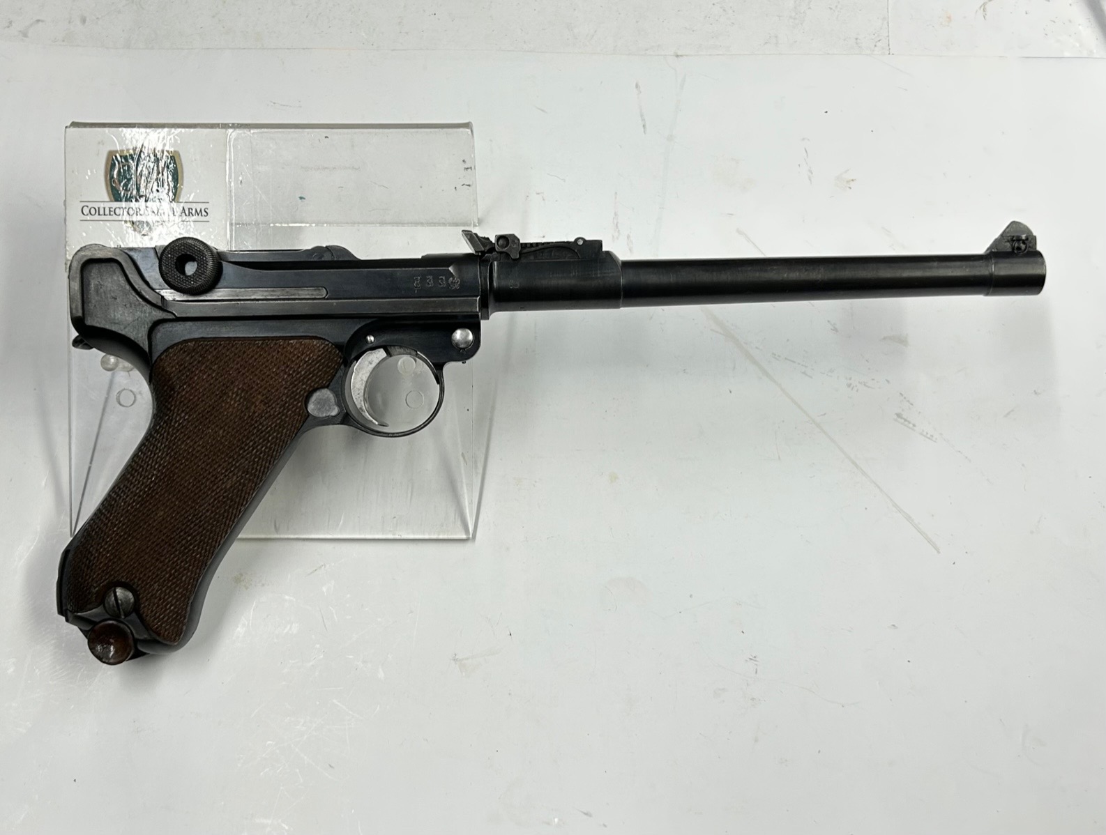 La “Luger Artiglieria” è il modello adottato nel 1914 con la denominazione “Lange Pistole 08“, facilmente riconoscibile per la canna lunga 200 mm, la tacca di mira regolabile a cursore e l’attacco per il calciolo; inizialmente destinata ai reparti di artiglieria in sostituzione dei troppo ingombranti Mauser 98, fu utilizzata anche dalla neonata aviazione del Kaiser. I primi modelli e fino alla metà del 1917, come questo esemplare, hanno la regolazione in deriva di tacca di mira e mirino.