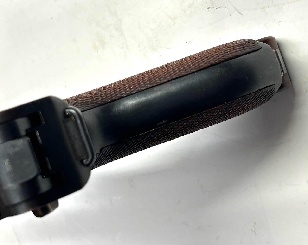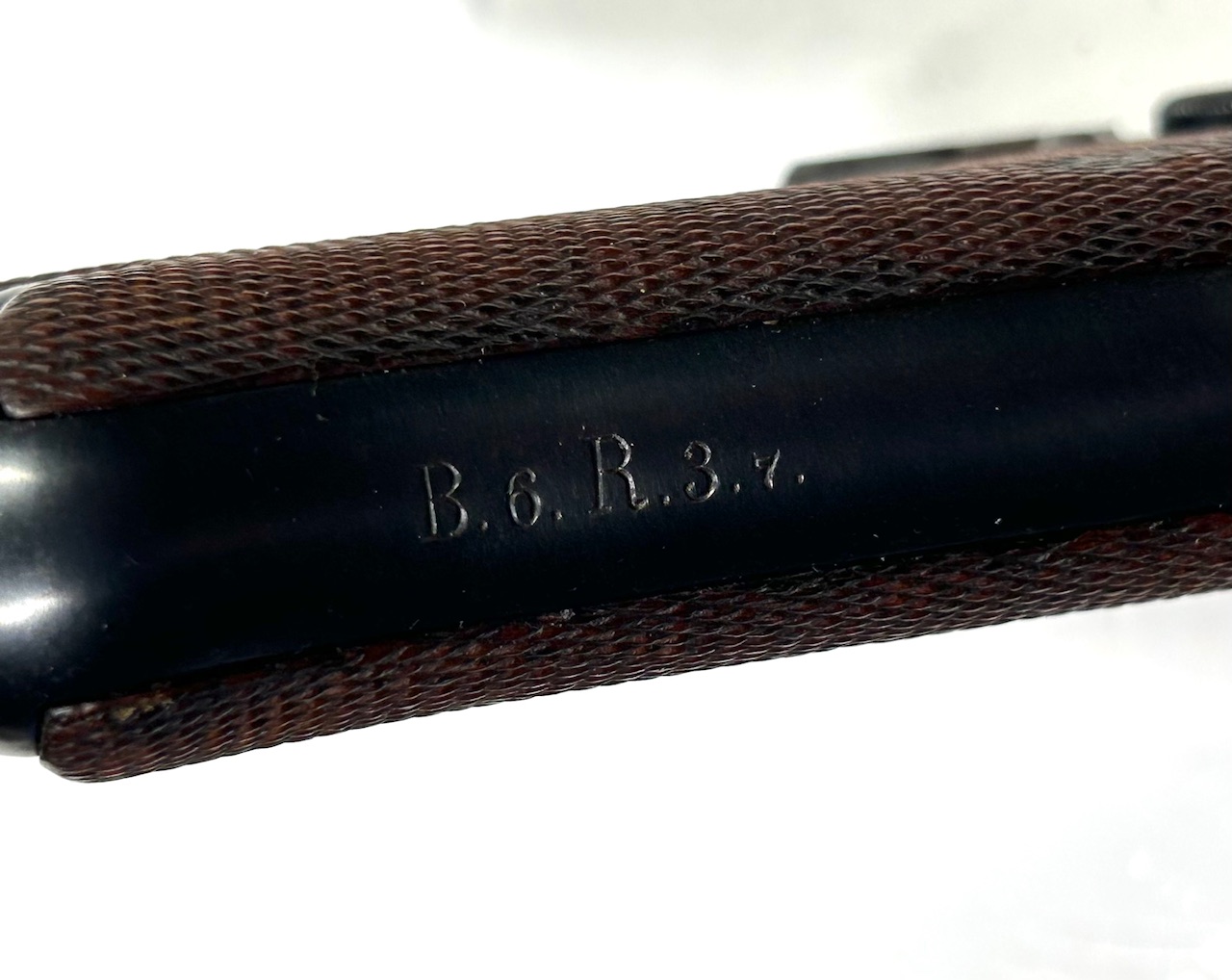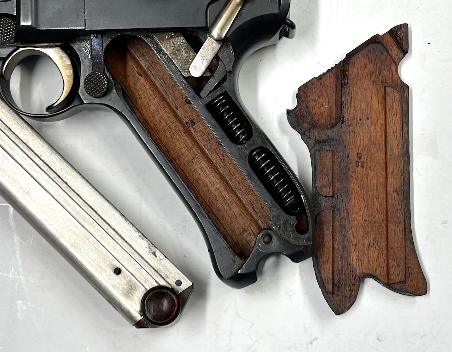 Luger imperiale prodotta dalla D.W.M. per l’esercito tedesco nel 1911, ancora senza attacco calciolo nel fusto e senza hold open, tutta monomatricola (compresi percussore e guancette), punzoni di accettazione imperiali ben visibili, sul fronte dell’impugnatura i marchi di reparto del Regno di Baviera “B.6.R.3.7” (6^ Reggimento di fanteria Bavarese, 3^ compagnia, arma nr.7), sulla camera l’anno “1911” e sul ginocchiello il logo della Deutsche Waffen- und Munitionsfabriken . Finitura ricondizionata professionalmente, brunitura lucida condizioni 95%, grilletto, leve e piccole parti riportate al corretto colore paglierino, canna buona con rigatura leggermente opaca, guancette in noce ben conservate, molto bello il caricatore primo tipo nichelato con fondello legno e numeri grandi.