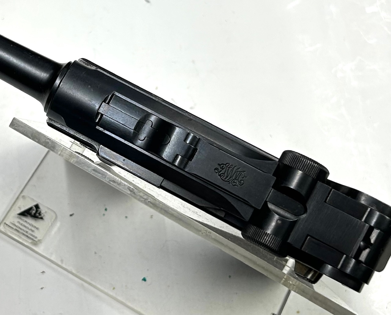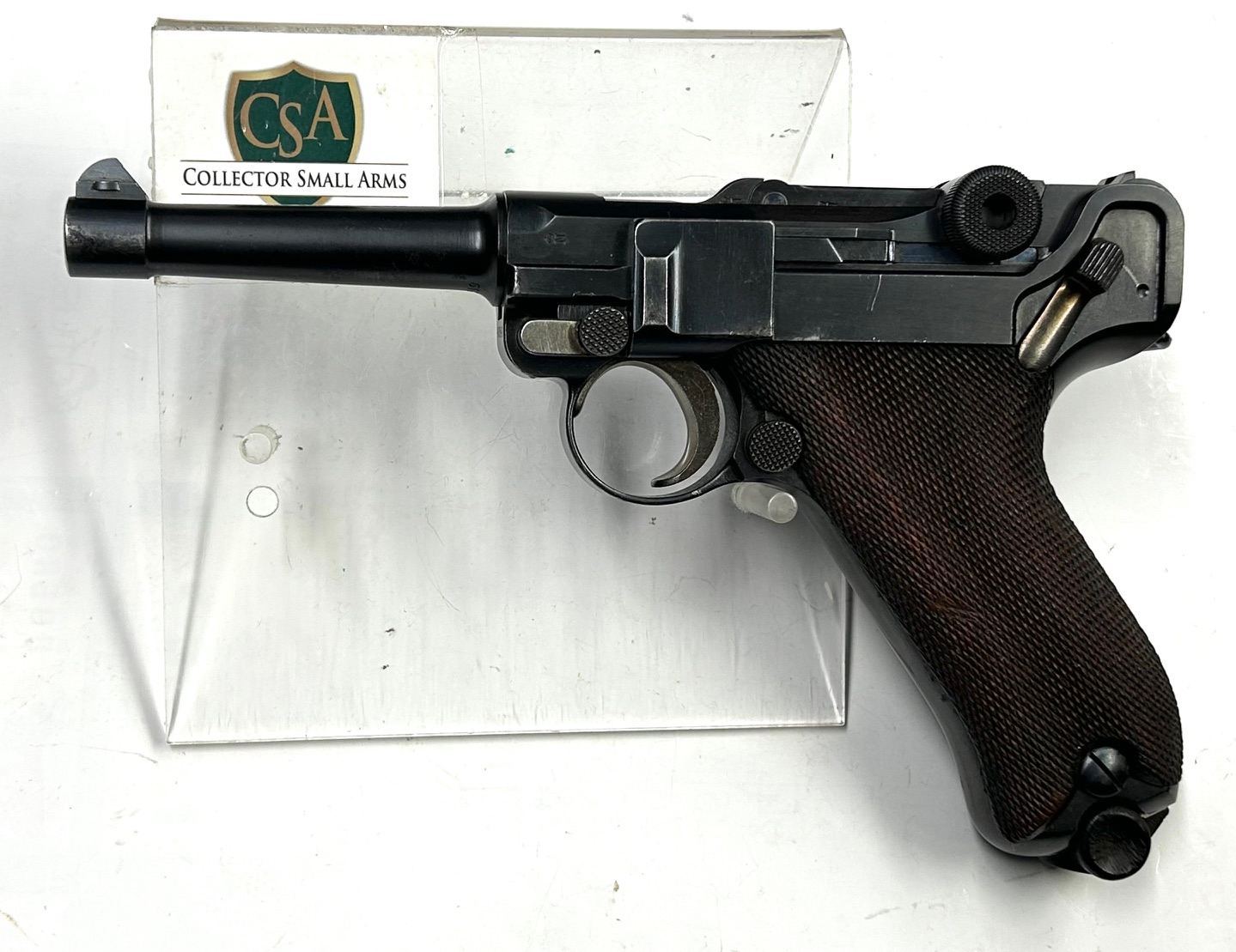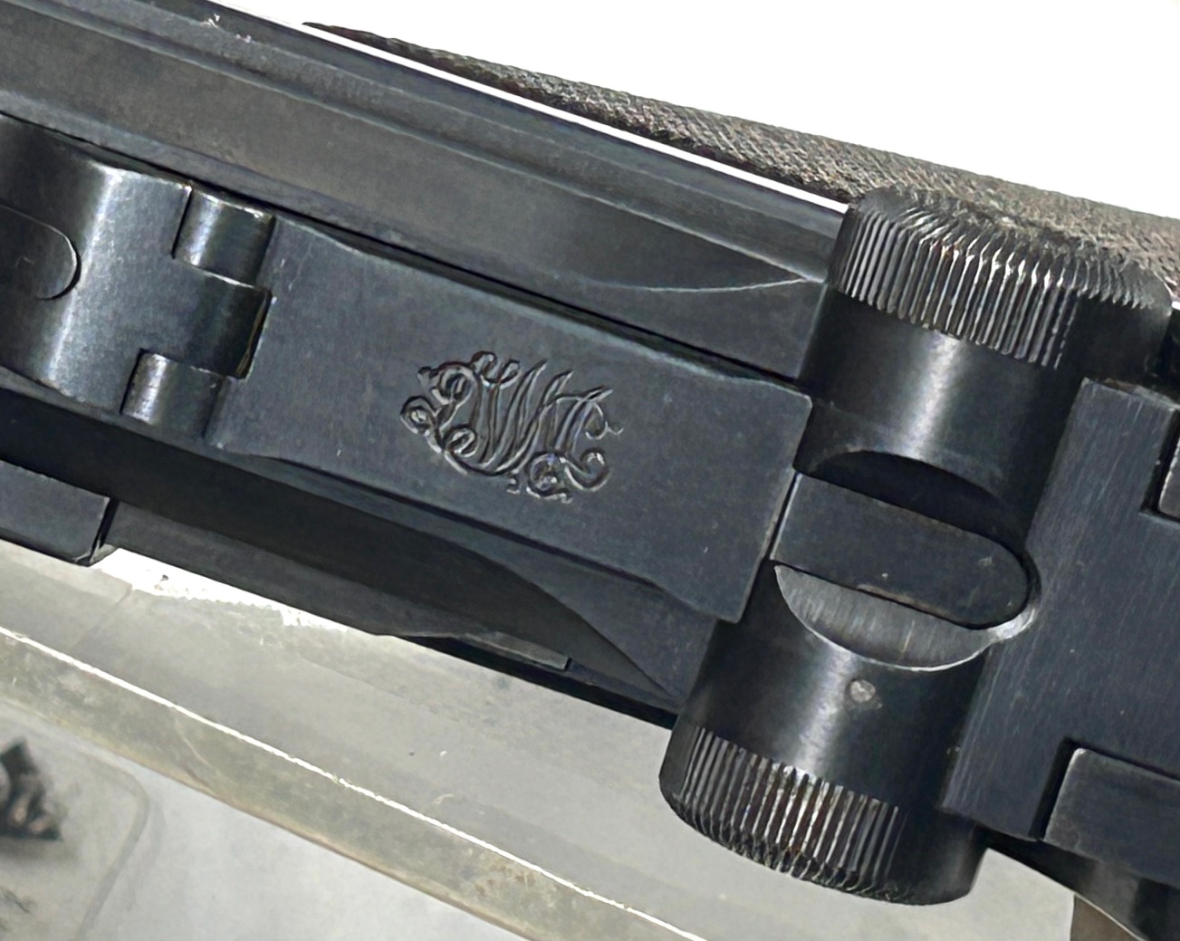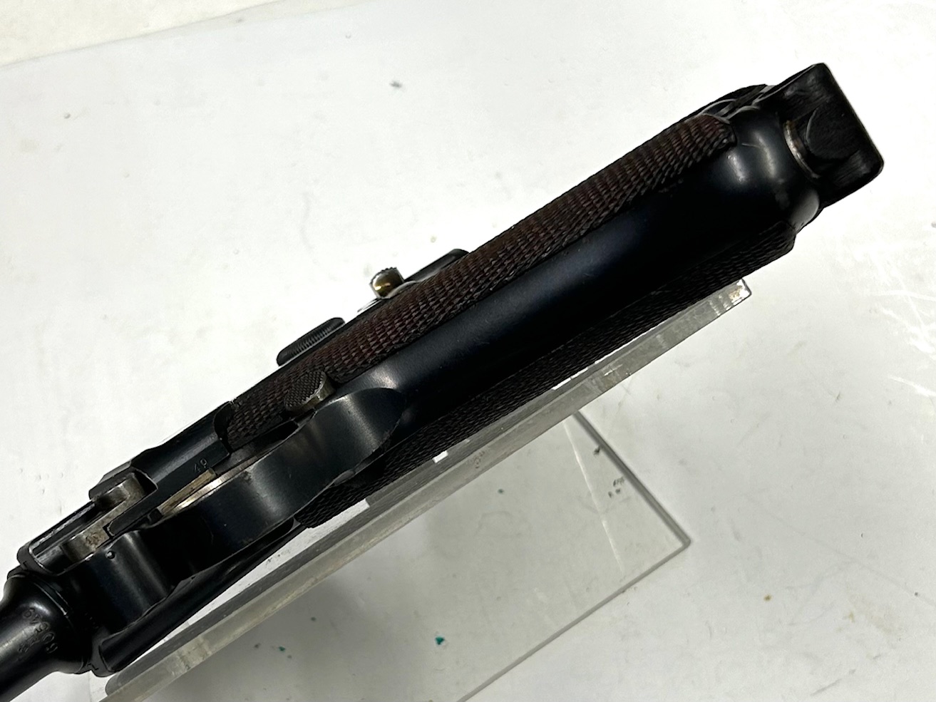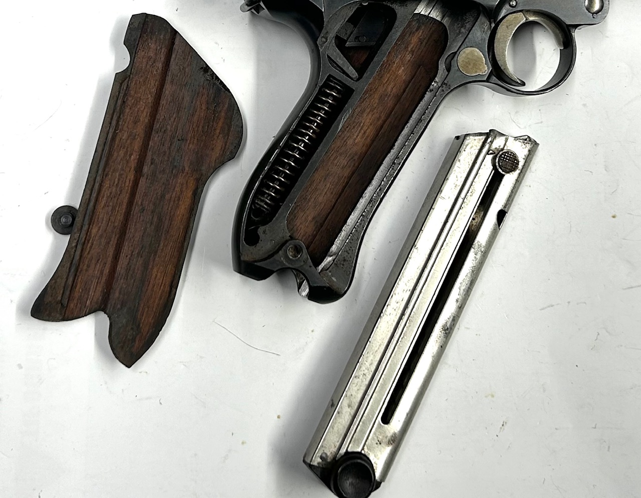 Luger prodotta dalla Deutsche Waffen-und-Mjunitionsfabrik prima della grande guerra per il mercato commerciale, rara in questo calibro (le 08 non militari erano per lo più in 7,65 Para), l’assenza del sistema hold open e il punzone del banco di prova “N coronata” in posizione orrizzontale la datano intorno al 1912; le condizioni originali sono splendide, la brunitura “a ruggine” conservata oltre 90%, tutta monomatricola, canna splendida, meccanica perfetta, le parti non brunite conservano parte del colore paglierino, caricatore originale con fondello legno.