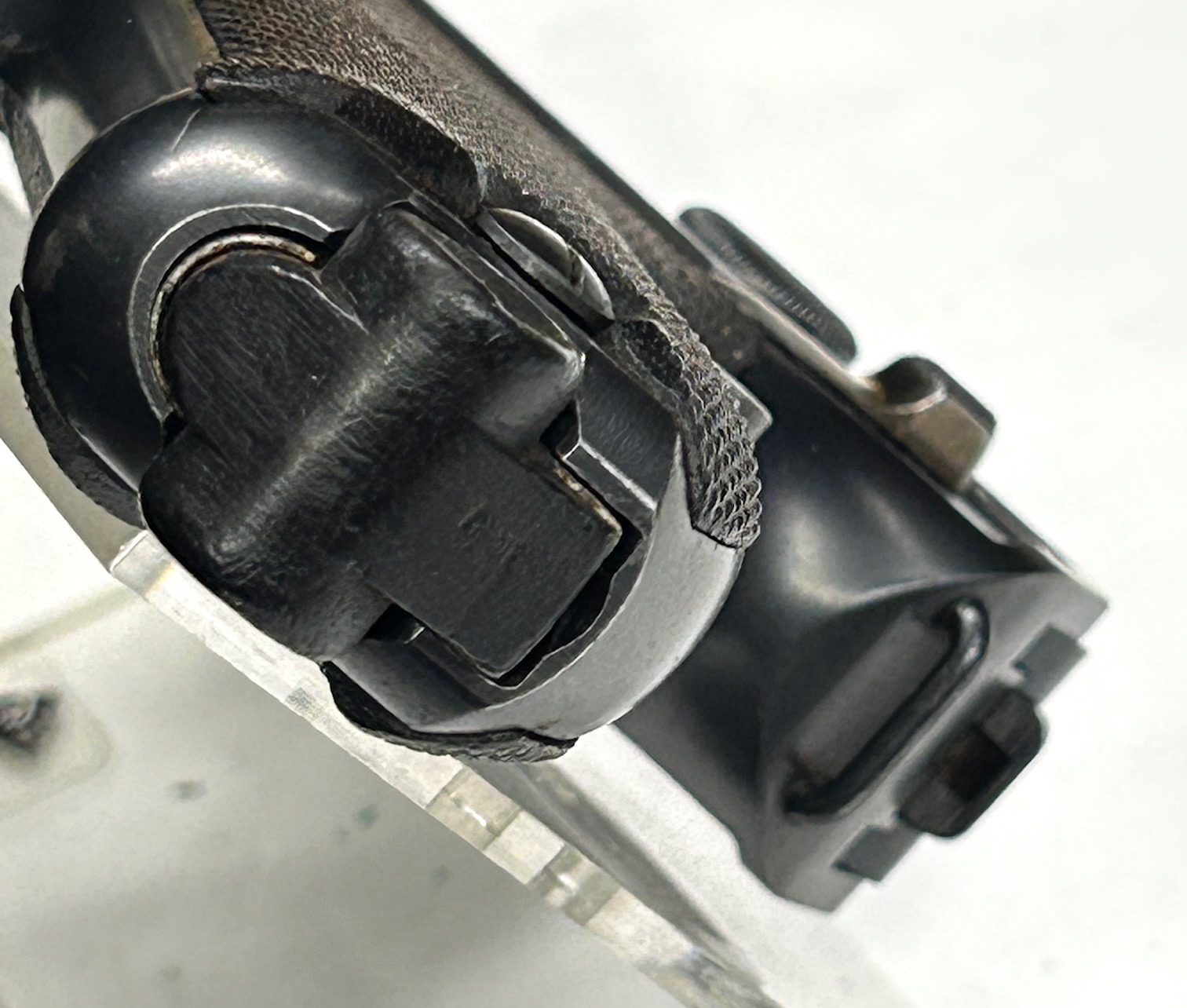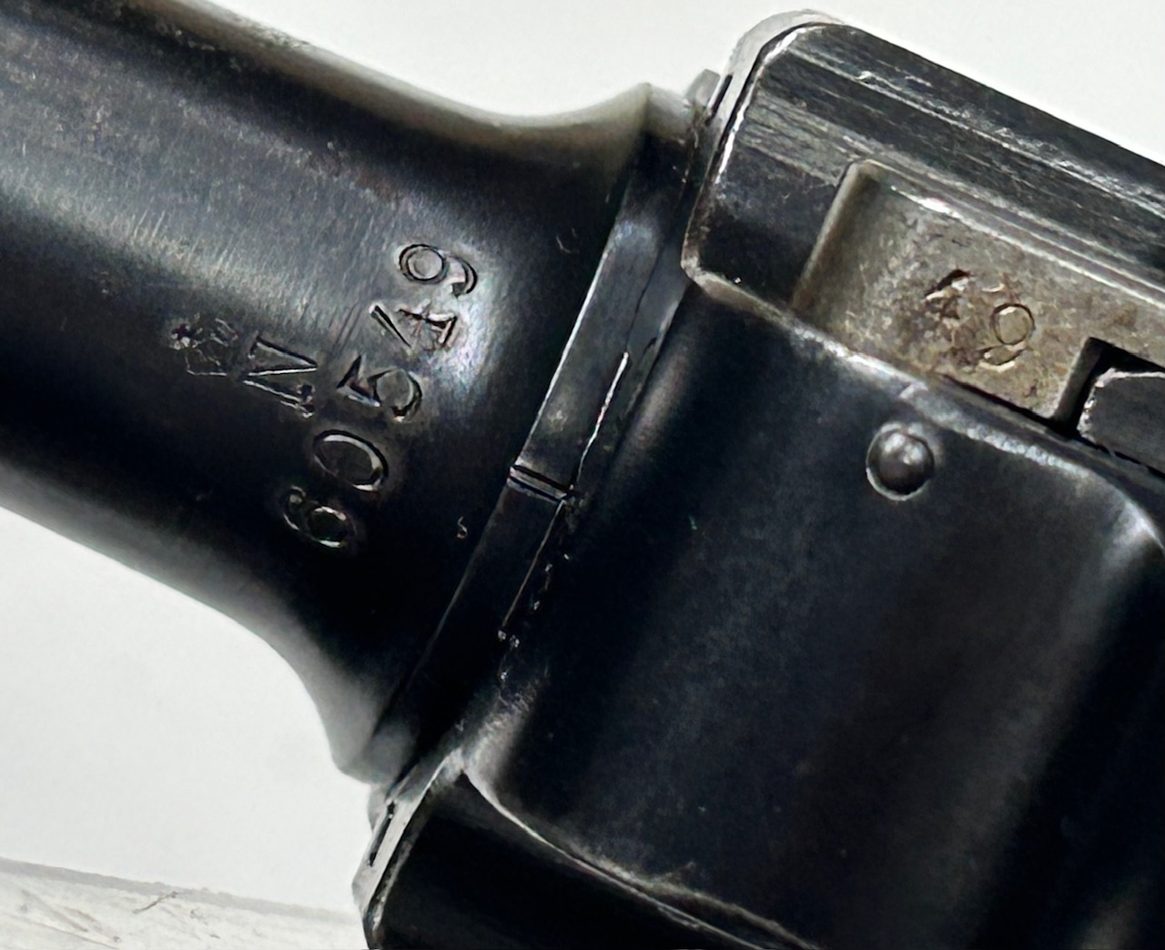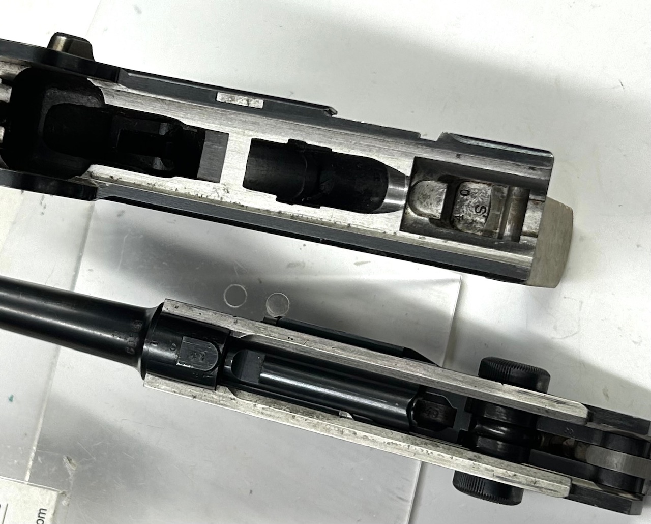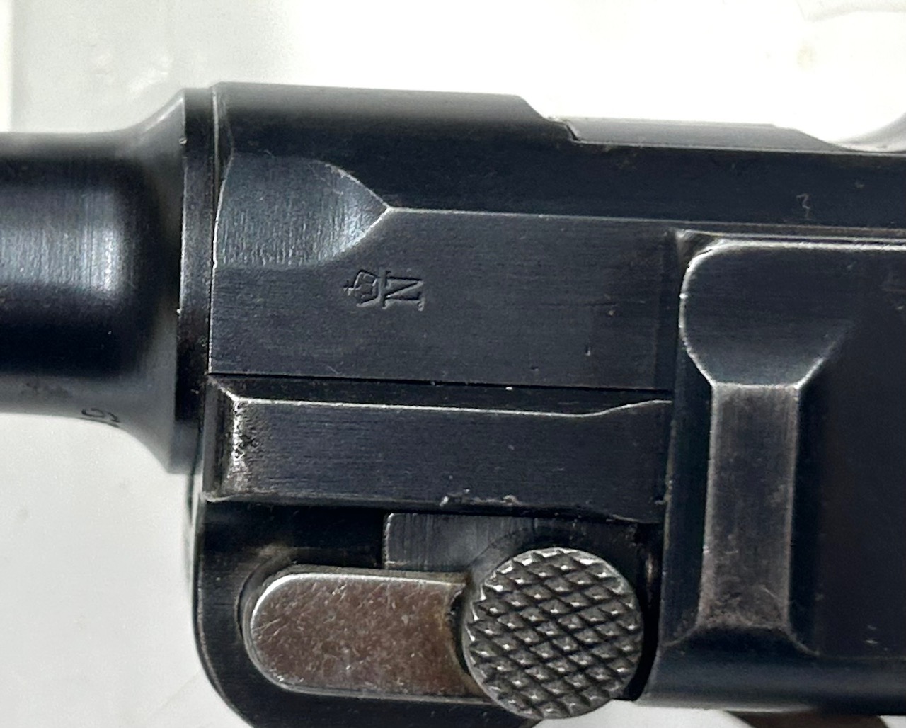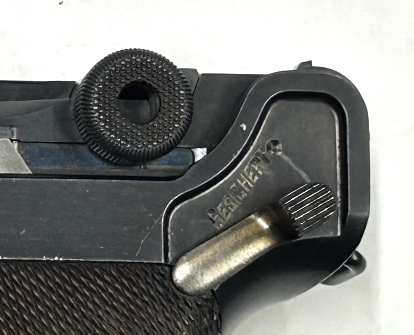 Luger prodotta dalla Deutsche Waffen-und-Mjunitionsfabrik prima della grande guerra per il mercato commerciale, rara in questo calibro (le 08 non militari erano per lo più in 7,65 Para), l’assenza del sistema hold open e il punzone del banco di prova “N coronata” in posizione orrizzontale la datano intorno al 1912; le condizioni originali sono splendide, la brunitura “a ruggine” conservata oltre 90%, tutta monomatricola, canna splendida, meccanica perfetta, le parti non brunite conservano parte del colore paglierino, caricatore originale con fondello legno.