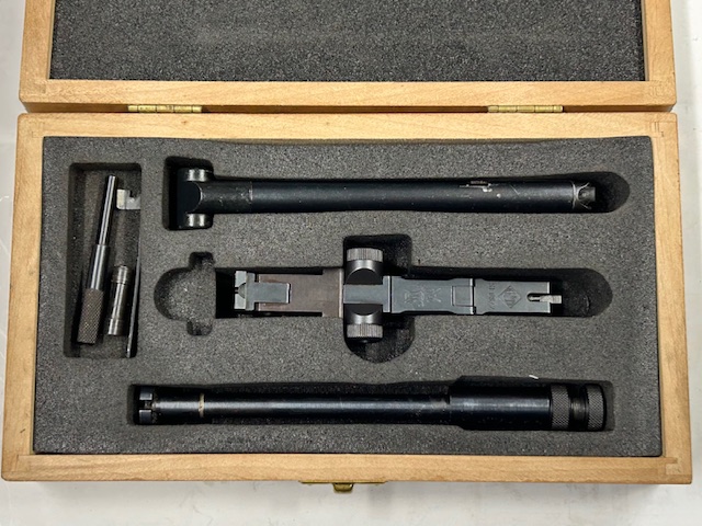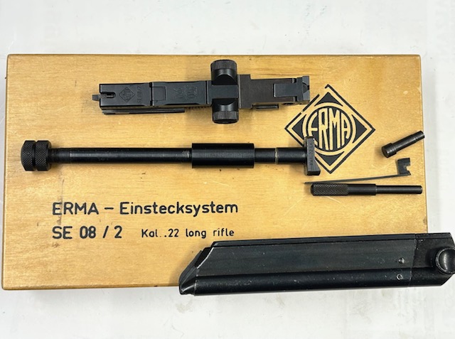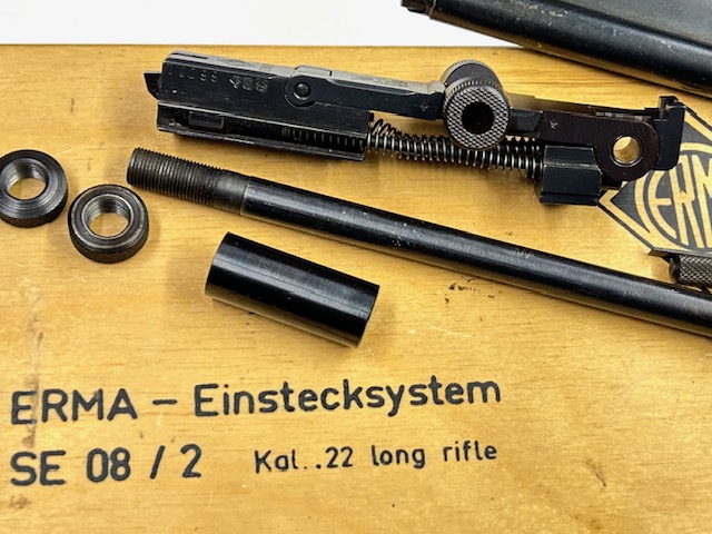 Kit post bellico di fabbricazione ERMA WERKE per convertire le Luger P08 in 9×19 all’utilizzo del calibro 22 L.R. mantenendo il funzionamento semiautomatico. Composto dal inserto canna con boccola, ginocchiello con molle di recupero e perno, caricatore, il tutto in condizioni pari al nuovo nel confanetto in legno originale, marchiato con il logo della fabbrica e la scritta “ERMA – Einstecksystem – SE 08 / 2 Kal. 22 long rifle“.