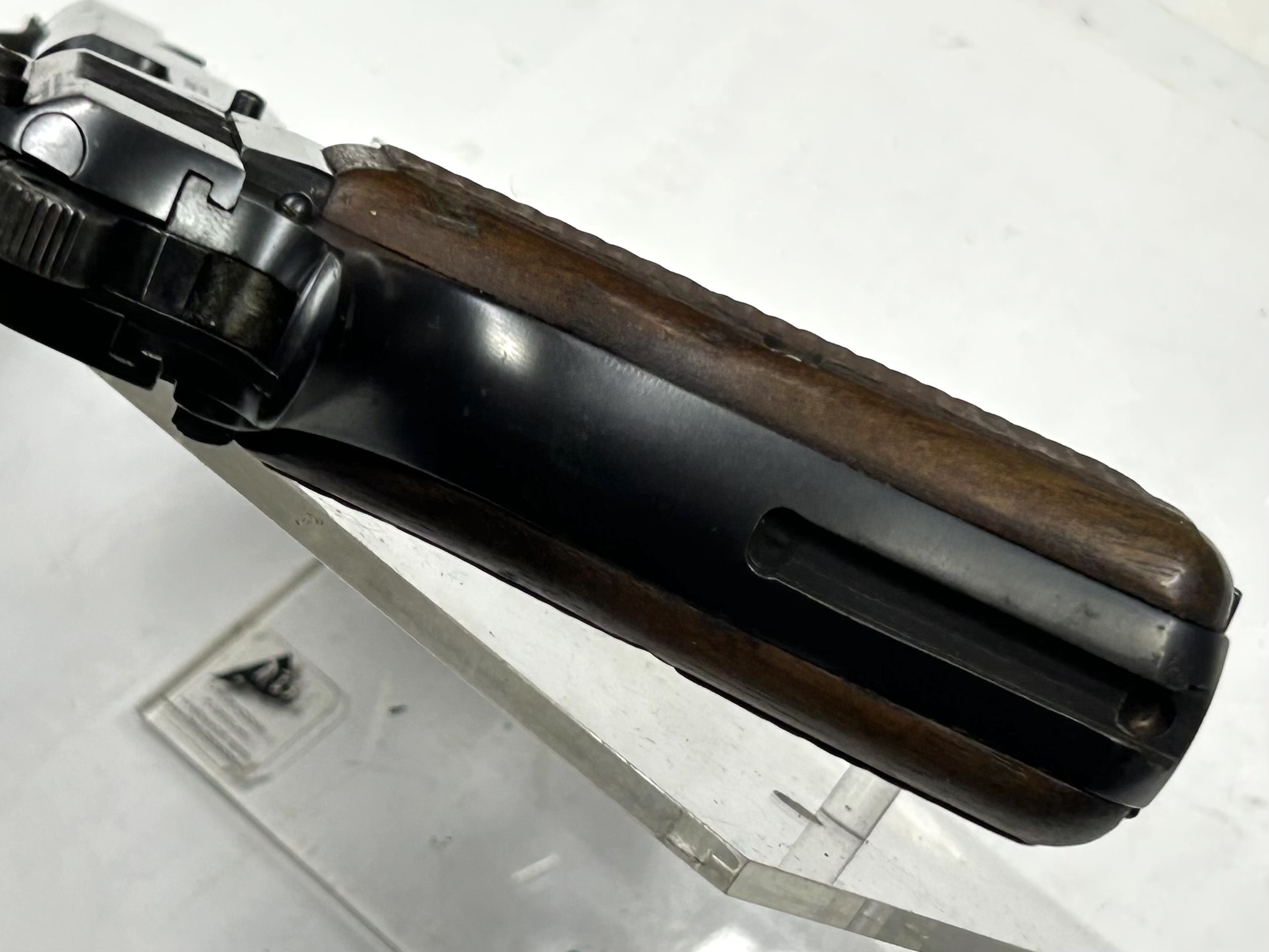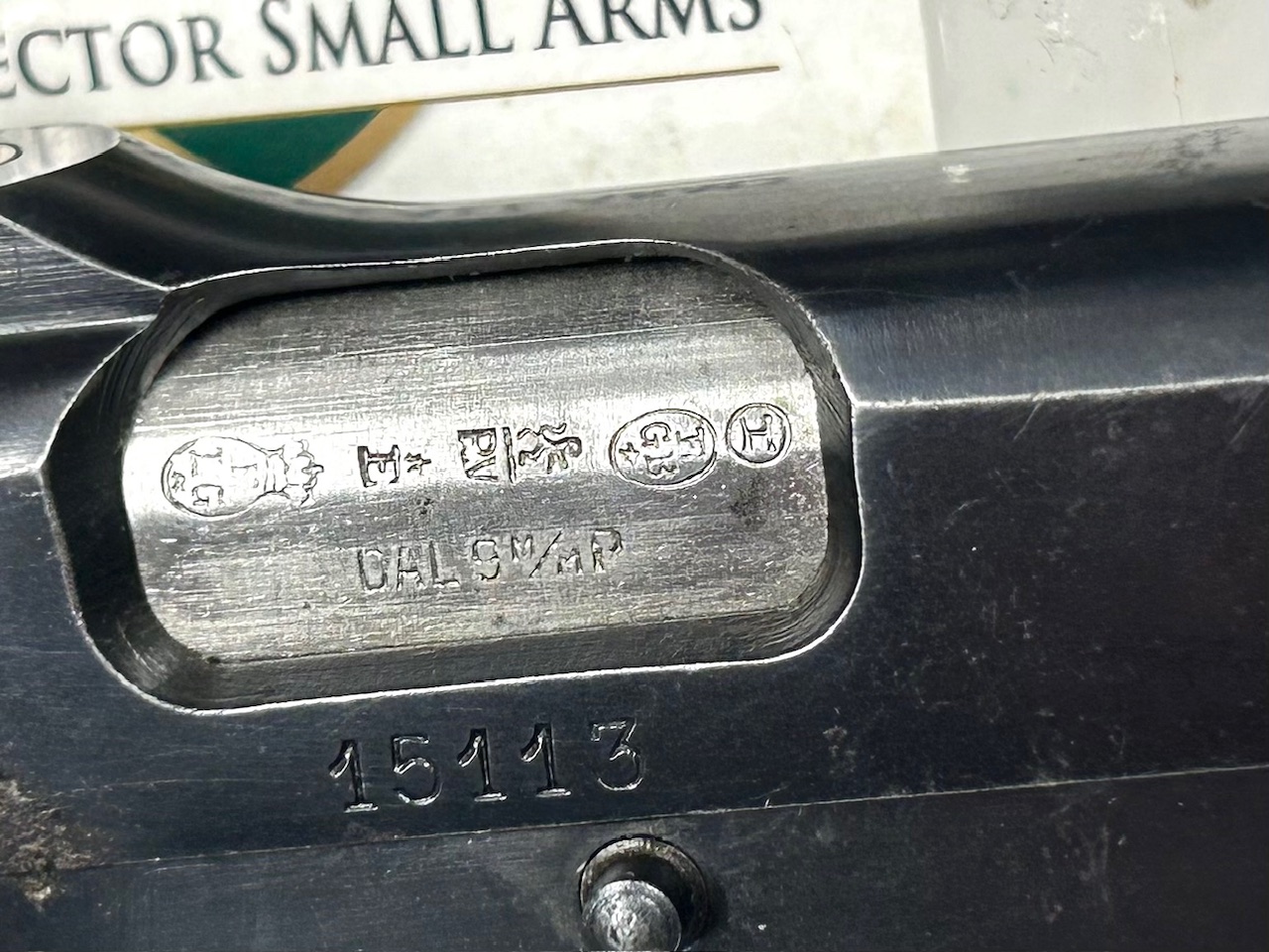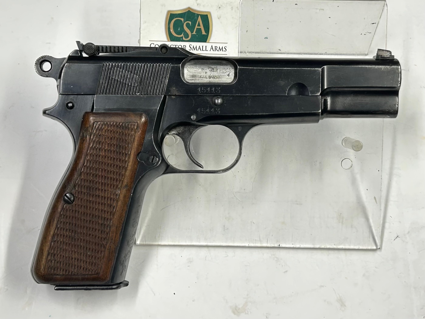 Rara HP35 (GP35) prima generazione, contratto militare per le forze armate del Belgio prima dell’occupazione tedesca, in condizioni splendide di brunitura originale, presenta oltre 95%, rigatura specchio, caricatore e guancette originali dell’epoca. matricola range 15mila riportata su fusto, carrello e parte non visibile della canna (corretto per le pre-40), oltre al banco di prova di Liegi sono presenti vari punzoni di accettazione degli ispettori militari belgi, tacca di mira con alzo a tangente del primo tipo graduato 50-500 su metà della lunghezza e alette di protezione sul carrello più sporgenti, profilo arrotondato sullo zoccolo della canna (poi sostituito da una lavorazione a spigolo).