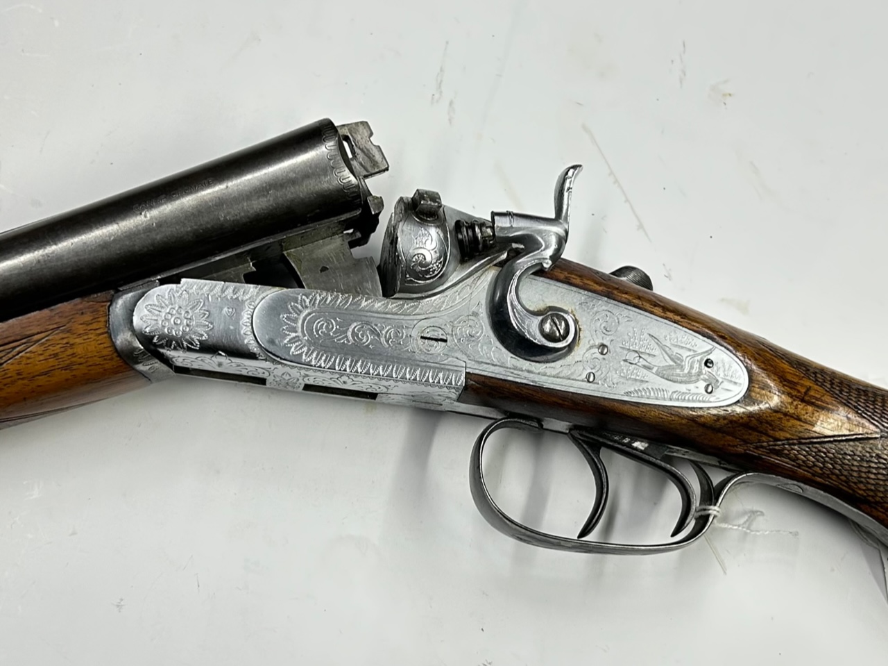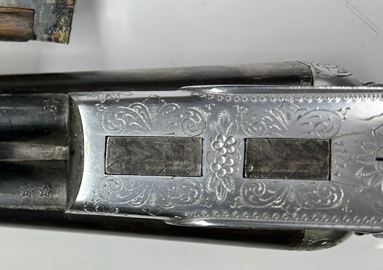 Doppietta cani esterni con chiusura “triple lock”, anno 1964, Canne 70 strozzature */**, buone condizioni generali, brunitura e legni con segni di utilizzo, canne perfette