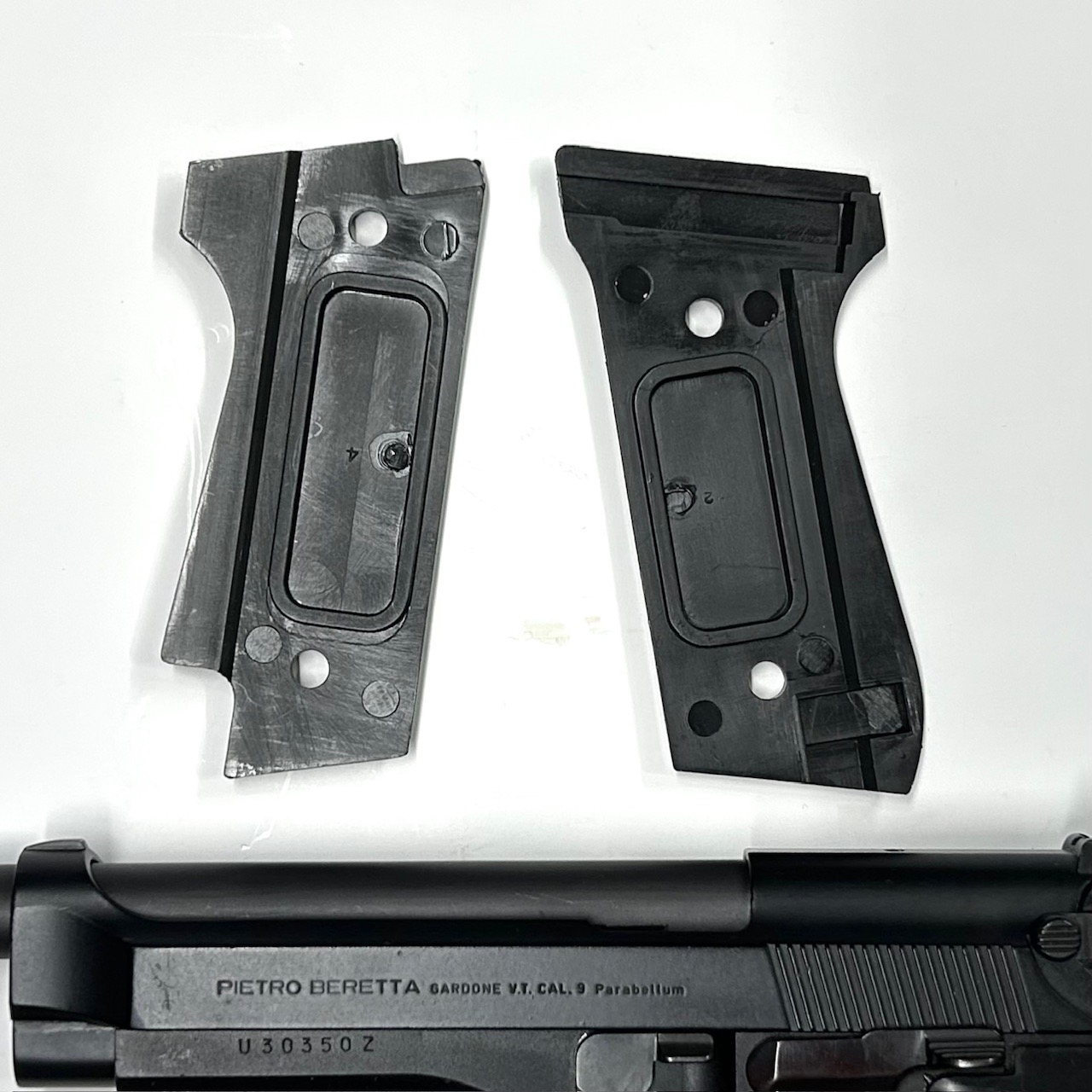 Originali BERETTA per modello “92 S”, con sgancio caricatore alla base dell’impugnatura; seconda variante con zigrino completo. Nuove da surplus di magazzino