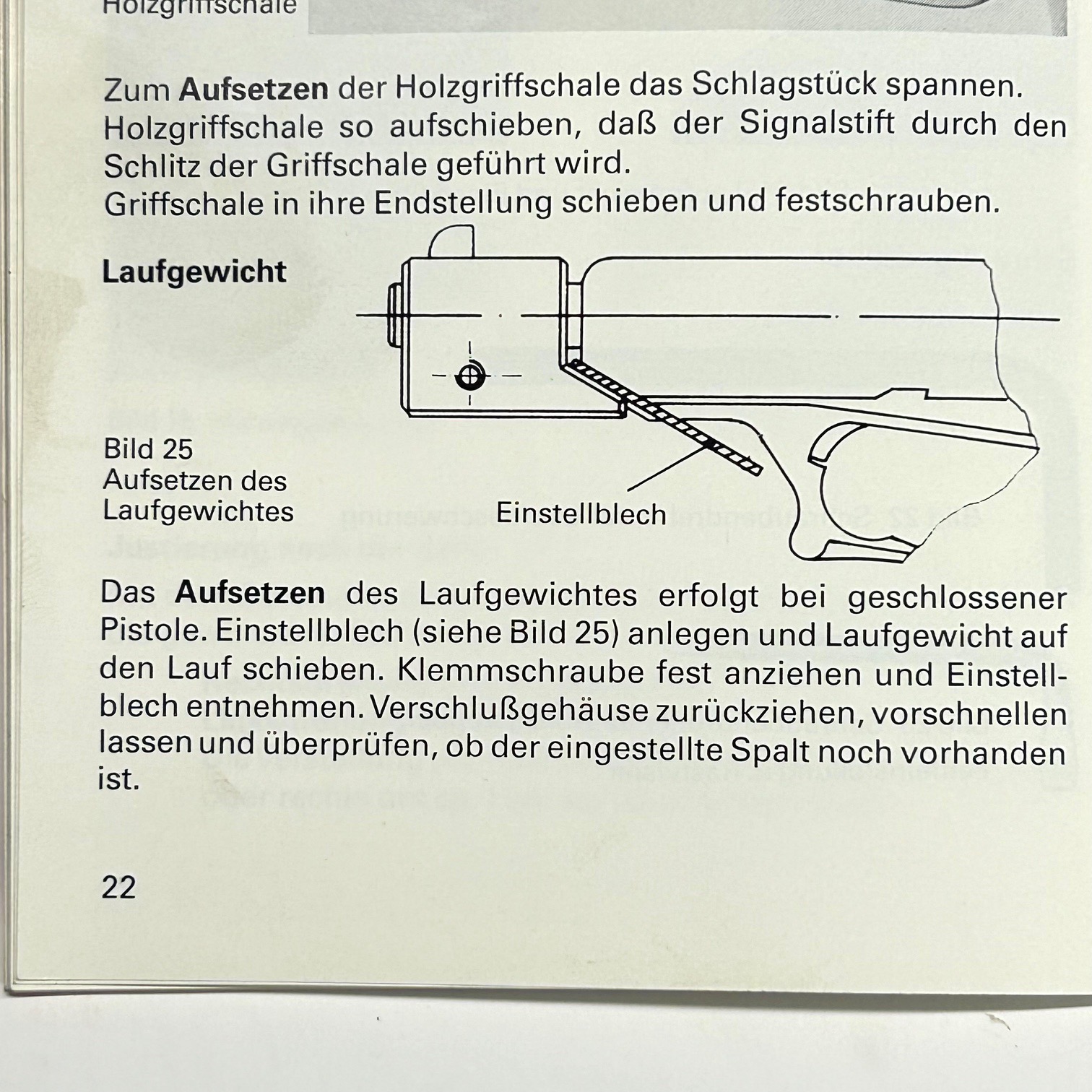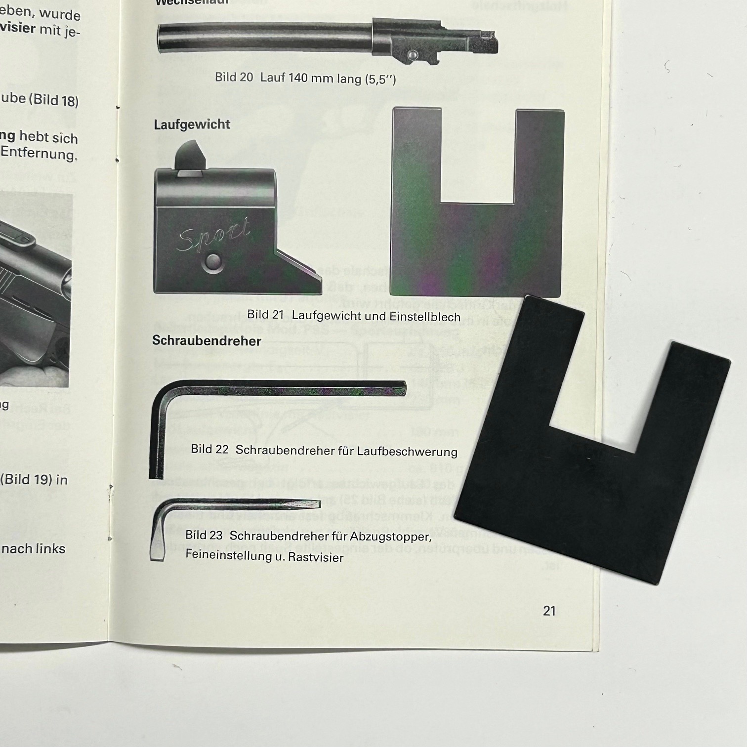 “Einstellblech für Laufgewich“, letteralmente piastra di regolazione per peso canna”; dotazione originale per la HECKLER & KOCH Mod. P9S versione Sportiva, si tratta di una piastra sagomata che funge da distanziale per posizionare correttamente il contrappeso sulla canna prima di chiudere la vite di serraggio; di fatto evita il rischio che posizionando il contrappeso con una distanza insufficiente, lo stesso urti il carrello durante il ciclo di sparo.