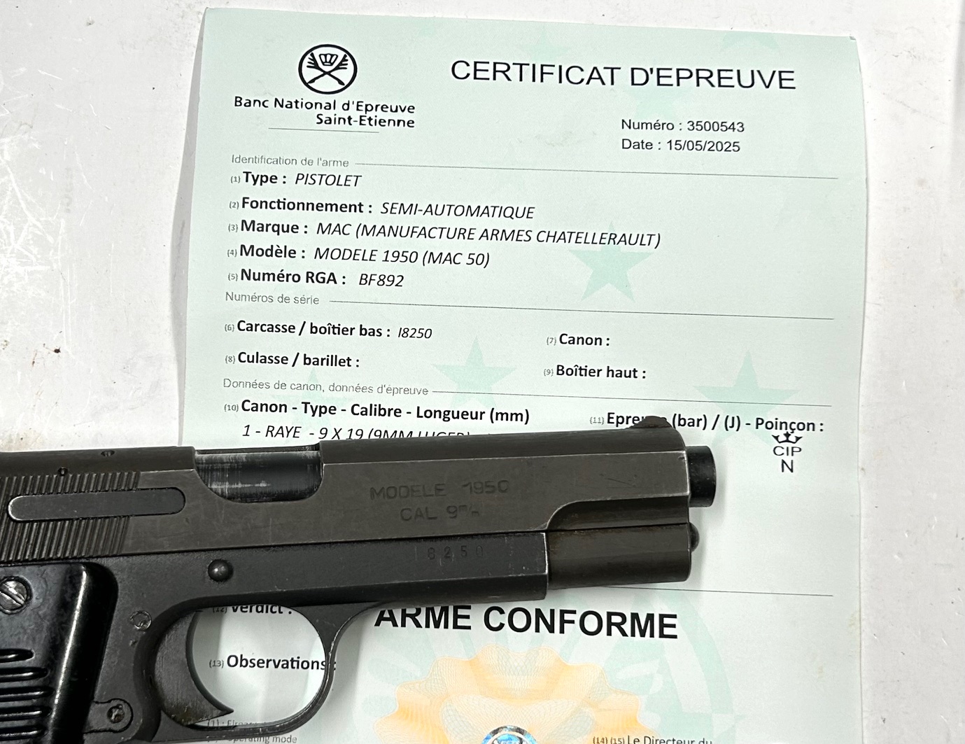 Adottata con la denominazione ufficiale di   Pistolet Automatique Modèle 1950 (PA Mle 1950), ha sostituito nell’esercito francese  le precedenti pistole Mle 1935A e Mle 1935S introducendo il calibro 9×19 con un sistema di chiusura tipo Browning-Colt; la produzione totale fu di circa 341mila pezzi, suddivisa tra due arsenali governativi;  inizialmente fu affidata alla MAC (Manufacture d’armes de Châtellerault) che fino al 1963 consegnò alle forze armate francesi 221900 unità; la MAS (Manufacture d’armes de St. Etienne) continuò