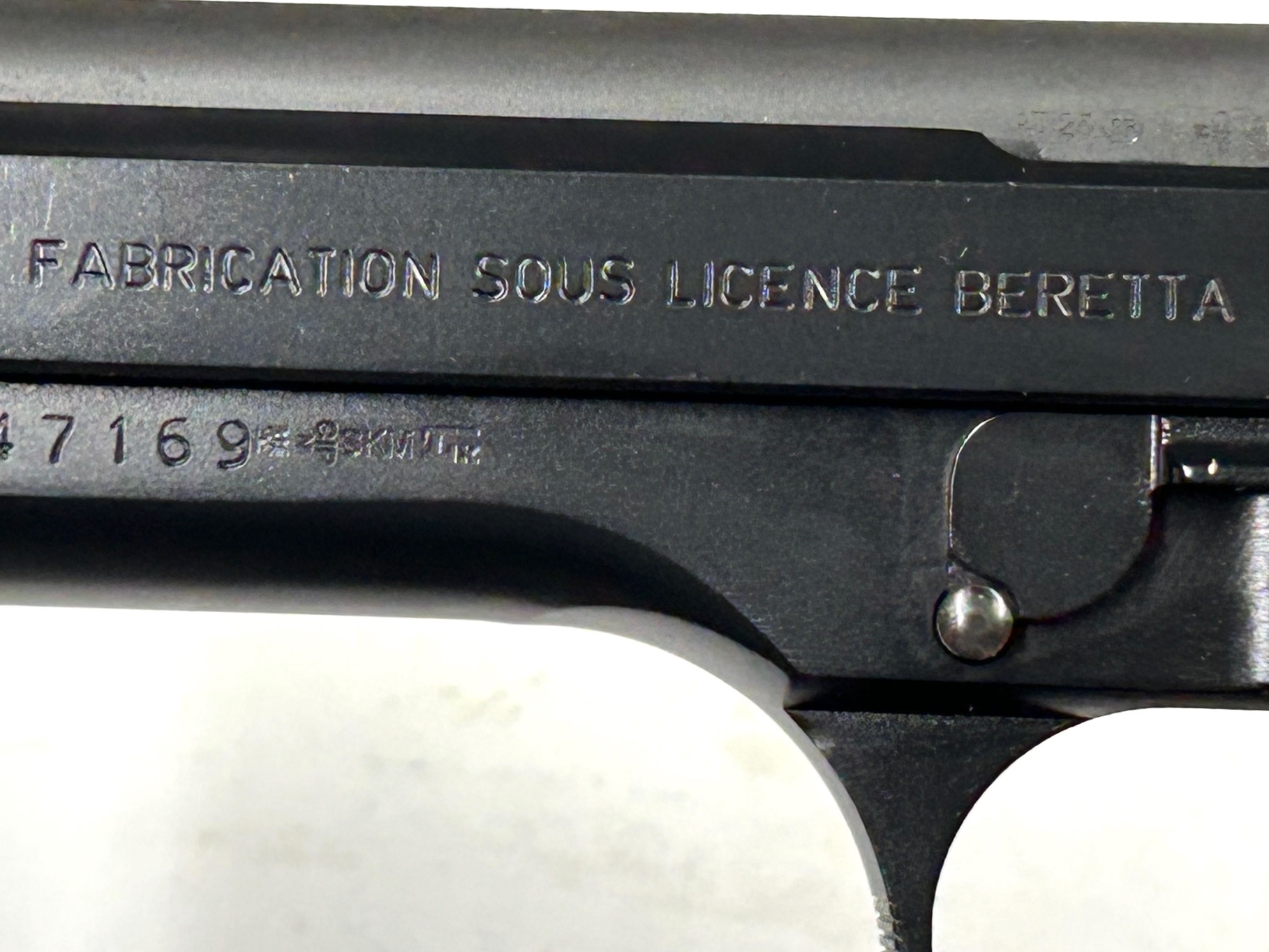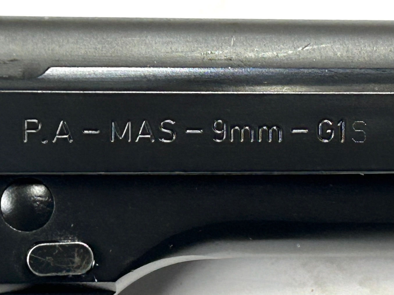 Carrello marcato “FABRICATION SOUS LICENCE BERETTA” su un lato e “P.A.-MAS-9mm-G1 S” sull’altro, dove la “S” è visibilmente aggiunta in un secondo tempo a testimoniare la modifica subita in arsenale per l’aggiunta della sicura contro l’arretramento del carrello in caso di rottura della chiusura, analogamente come avvenne con le Beretta da 92F a 92 FS;