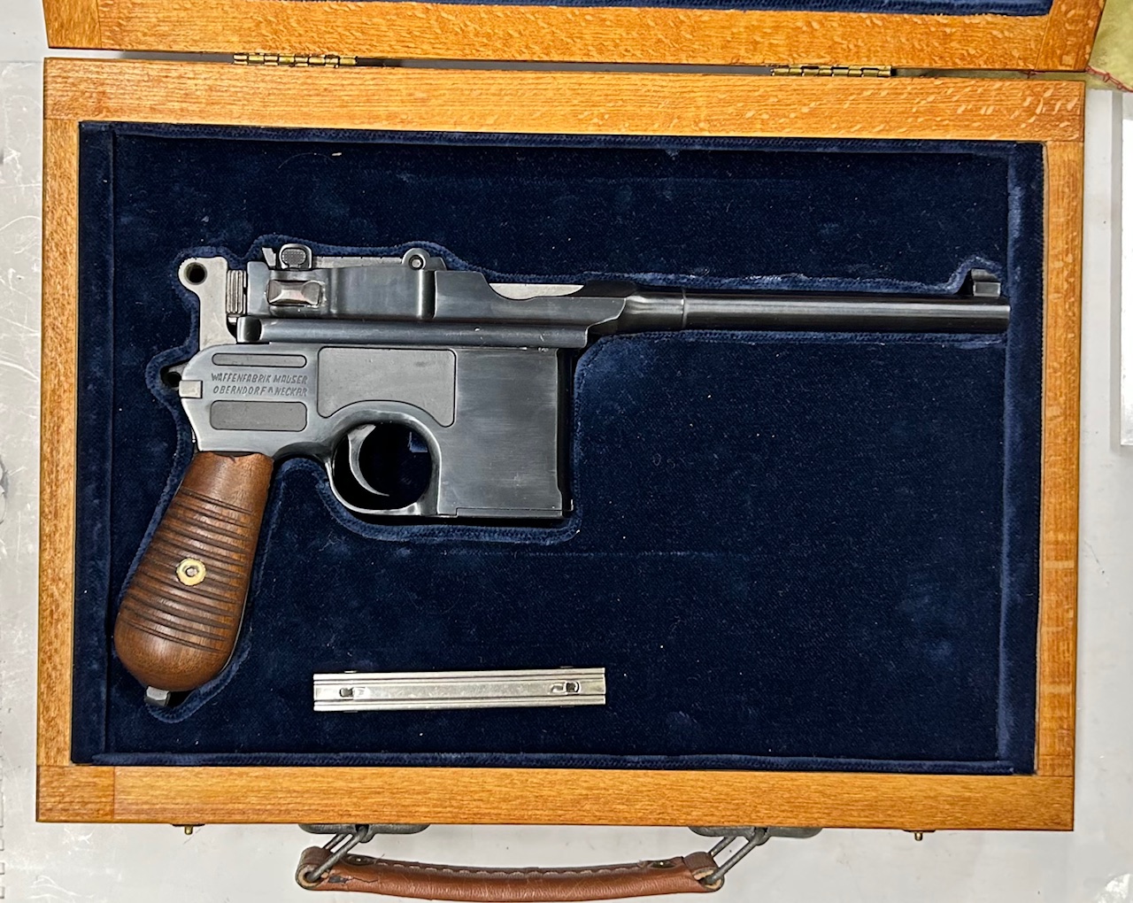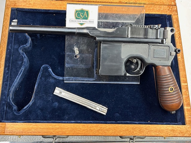 C96- M30 postbellica, restaurata e convertita per il calibro 9 mm Para dalla Federal Ordnance negli anni ’80; condizioni eccellenti, la brunitura del restauro è oltre 95% con una finitura opaca rispetto all’originale ma molto più resistente, canna e meccanica perfette. Oltre ai marchi standard delle 1930 WAFFENFABRIK MAUSER OBENDORF, sul lato della canna è inciso “9 mm. Parabellum” in caratteri gotici, e nella parte inferiore la scritta “Refurbished by Fed Ord Inc – SEM CA USA“. Fornita in cofanetto legno con interno in velluto e con una lastrina di caricamento.