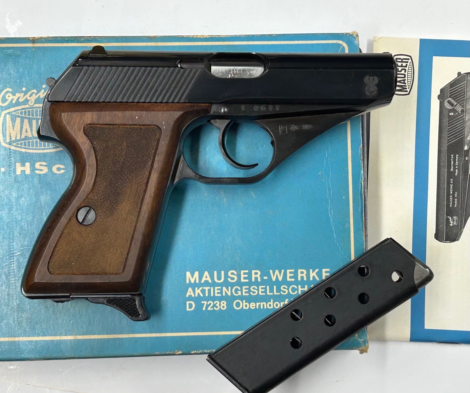 Condizio pari al nuovo, in confezione originale con secondo caricatore, scovolo, manuale e sovrascatola monomatricola. Sul lato sx del carrello marcata “MAUSER HSc – produced under license by RENATO GAMPA s.p.A. GARDONE V.T. ITALY” “cal.7,65 – cat.25” e sul lato dx inciso ad acido il logo della ditta bresciana.