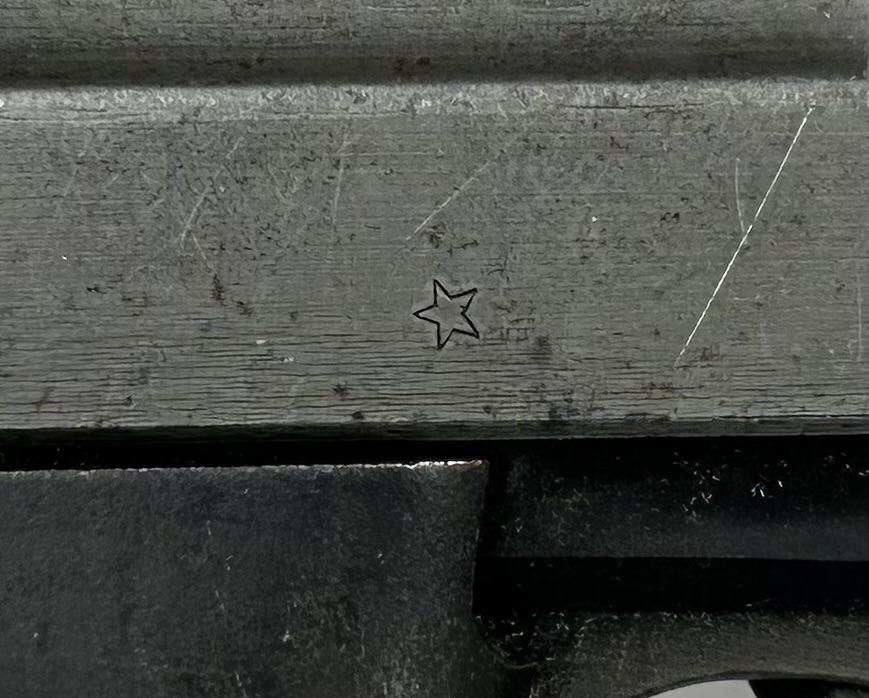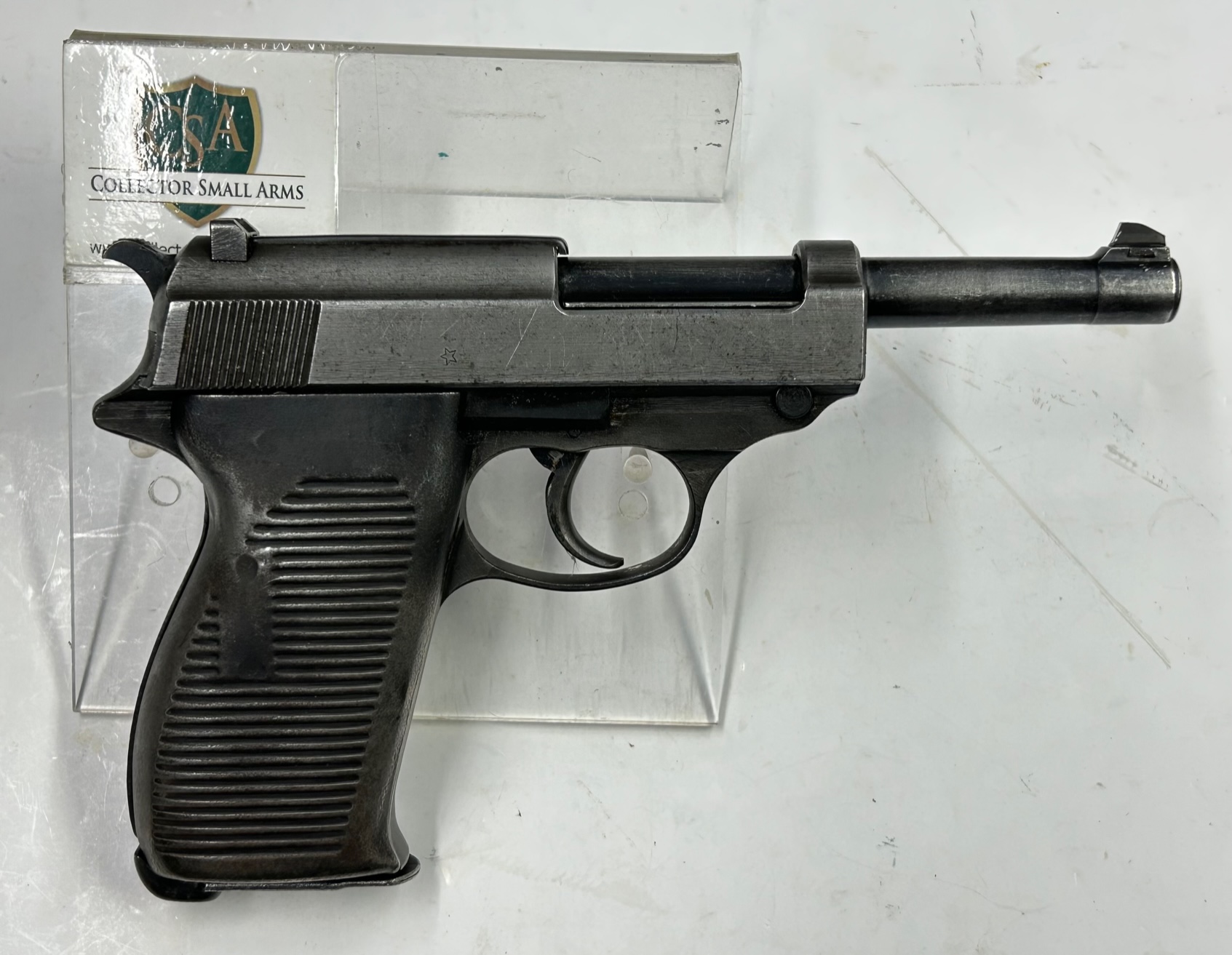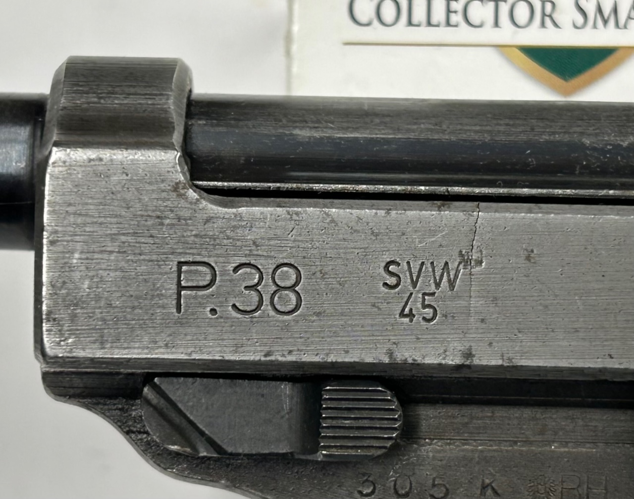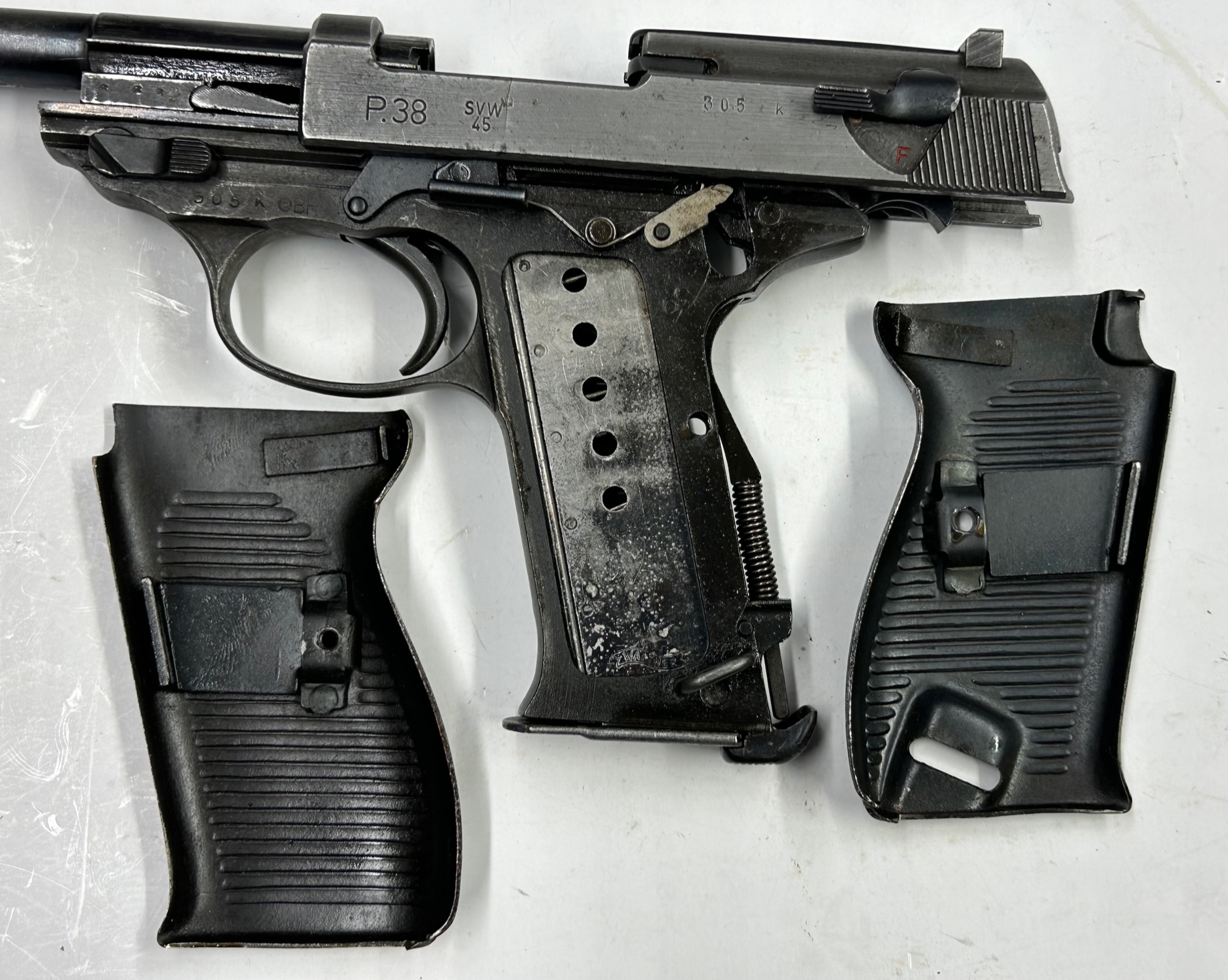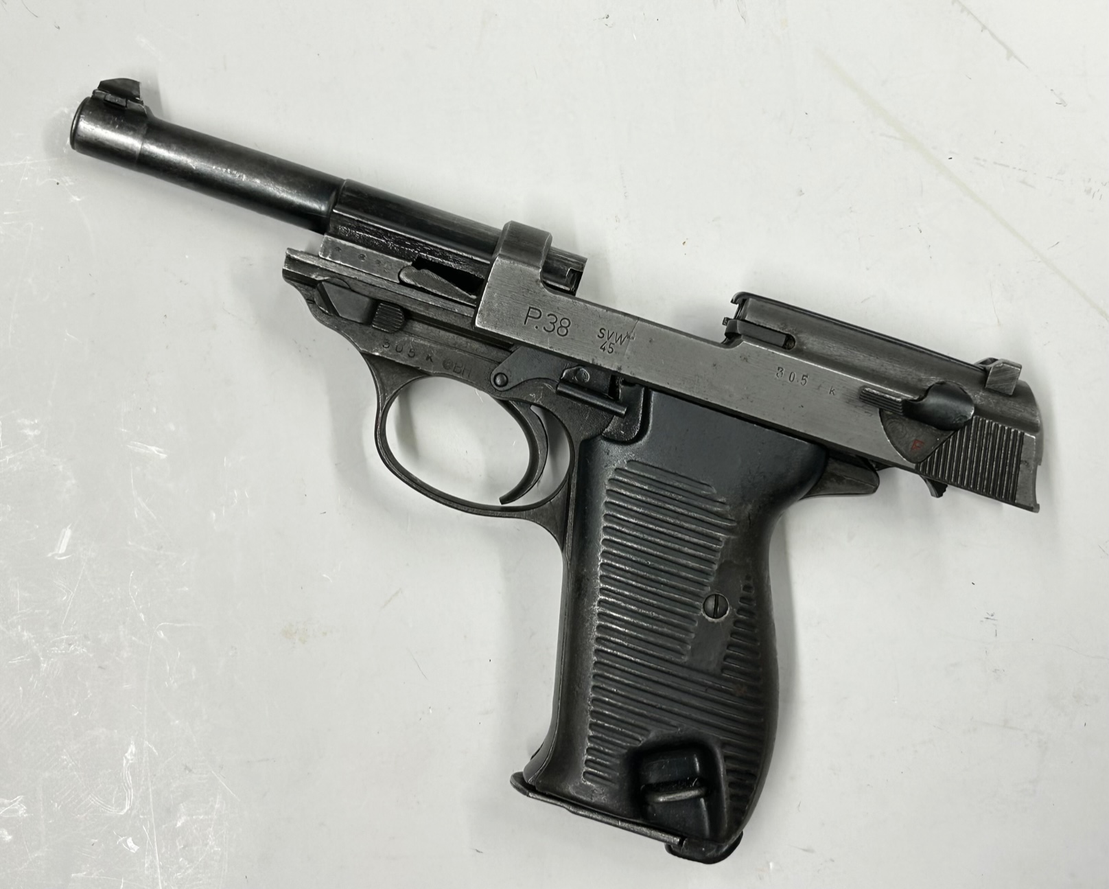 Una delle ultime P38 prodotte nella Germania nazista e assemblata a guerra finita quando la fabbrica MAUSER era già sotto il controllo delle truppe francesi, come testimonia il punzone della stella a cinque punte sul lato destro del carrello. Sul lato sinistro del carrello il codice del produttore “SVW” (= Mauser) e “45” per l’anno di fabbricazione; è stata in seguito fornita dagli alleati per riarmare il neonato esercito della Repubblica dell’Austria (punzone “Aquila+BH” sul fusto = BundesHeer) negli anni 50-60.