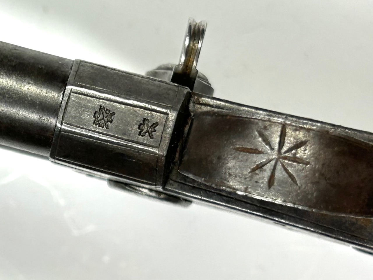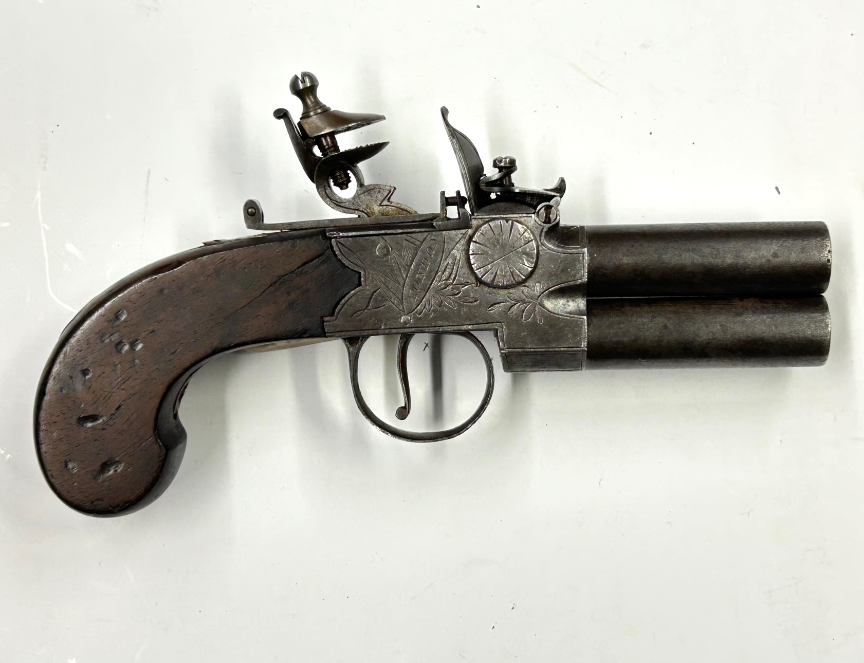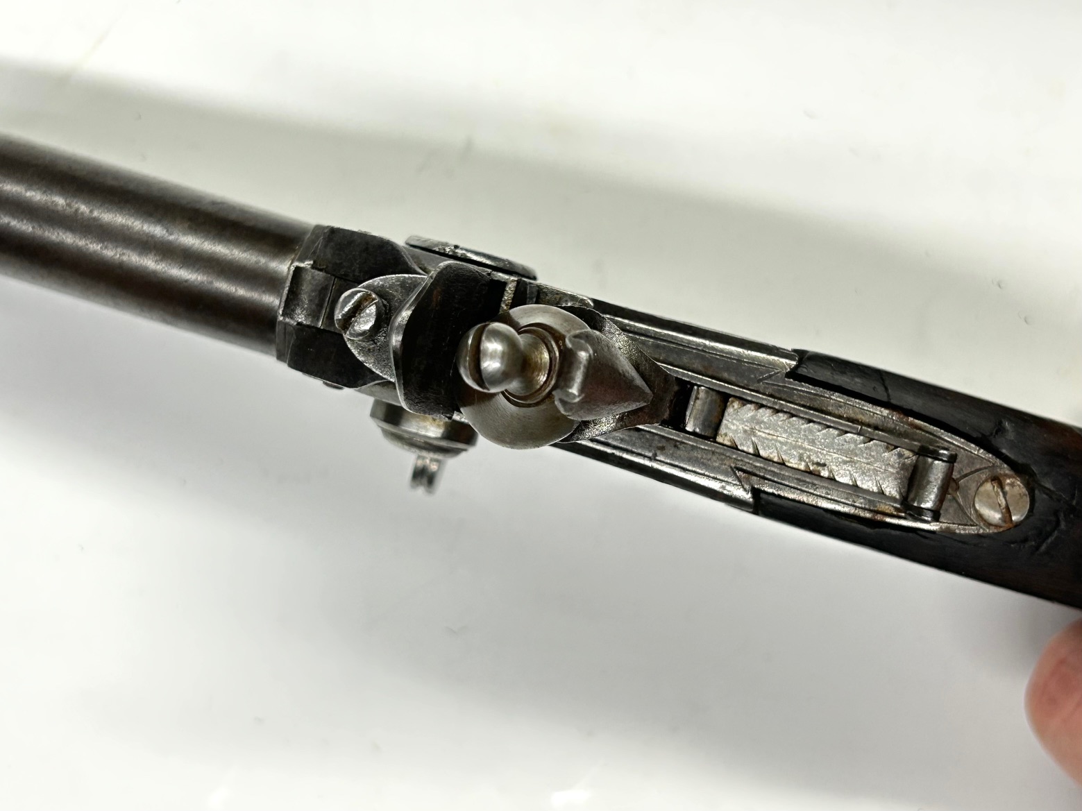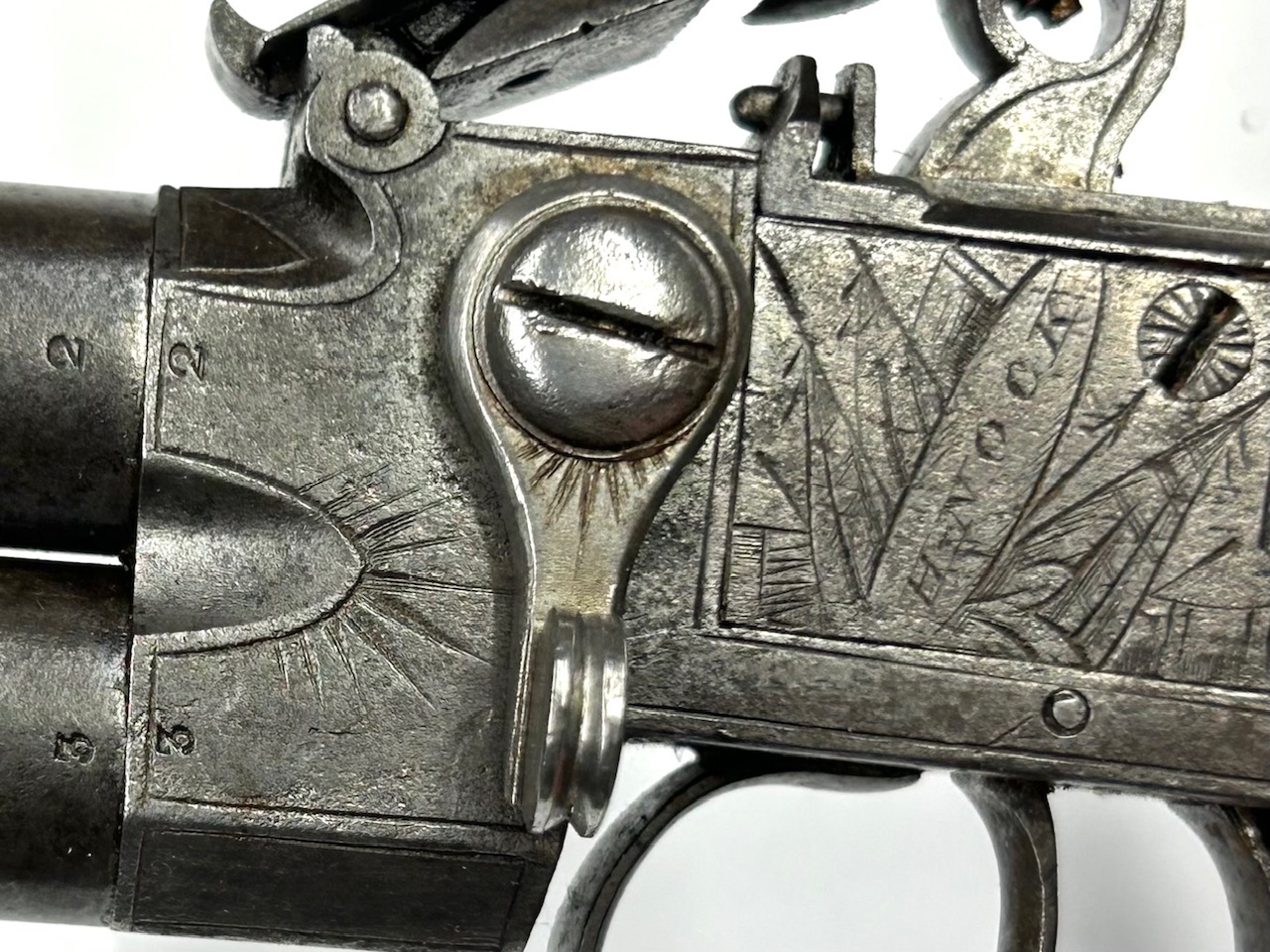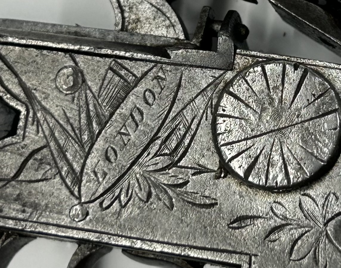 Condizioni originali eccellenti, meccanica funzionante, cartelle lavorate con disegni e riportato il nome del fabbricante inglese “H.NOCK” e “LONDON“, sicura sul dorso, leva selettore della canna, impugnatura in legno ben conservata, canne smontabili