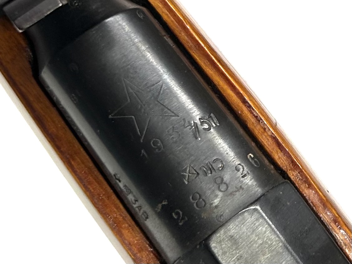 Mosin 1891/30 1^ serie prodotto utilizzando la culatta ottagonale dei 91 zaristi dall’arsenale di TULA nel 1934 per l’armata rossa, che nel 1951 lo ha ceduto alle Forze di Sicurezza del Ministero della Difesa: riporta l’aggiunta dell’anno “/51” e il punzone “MO” abbreviazione di “Ministerstvo Oborony“. Condizioni eccellenti di ferri e legni, canna specchio, monomatricola compreso otturatore, vari punzoni di arsenale russi, completo della rara baionetta con la stessa matricola dell’arma.