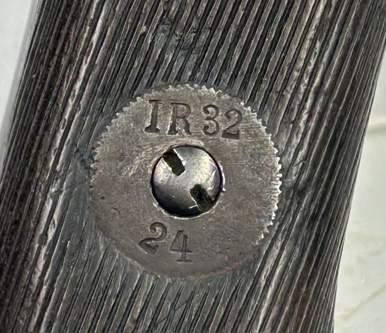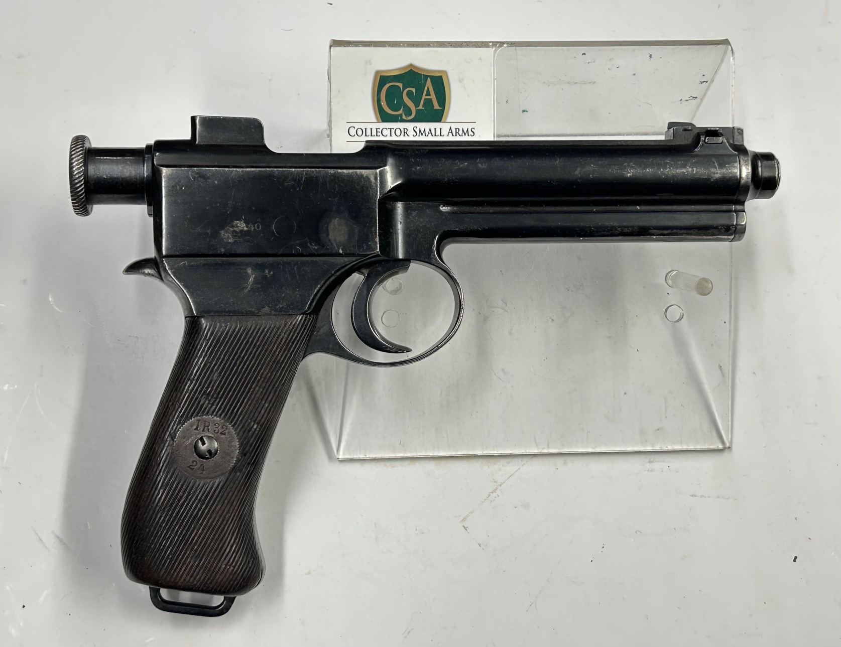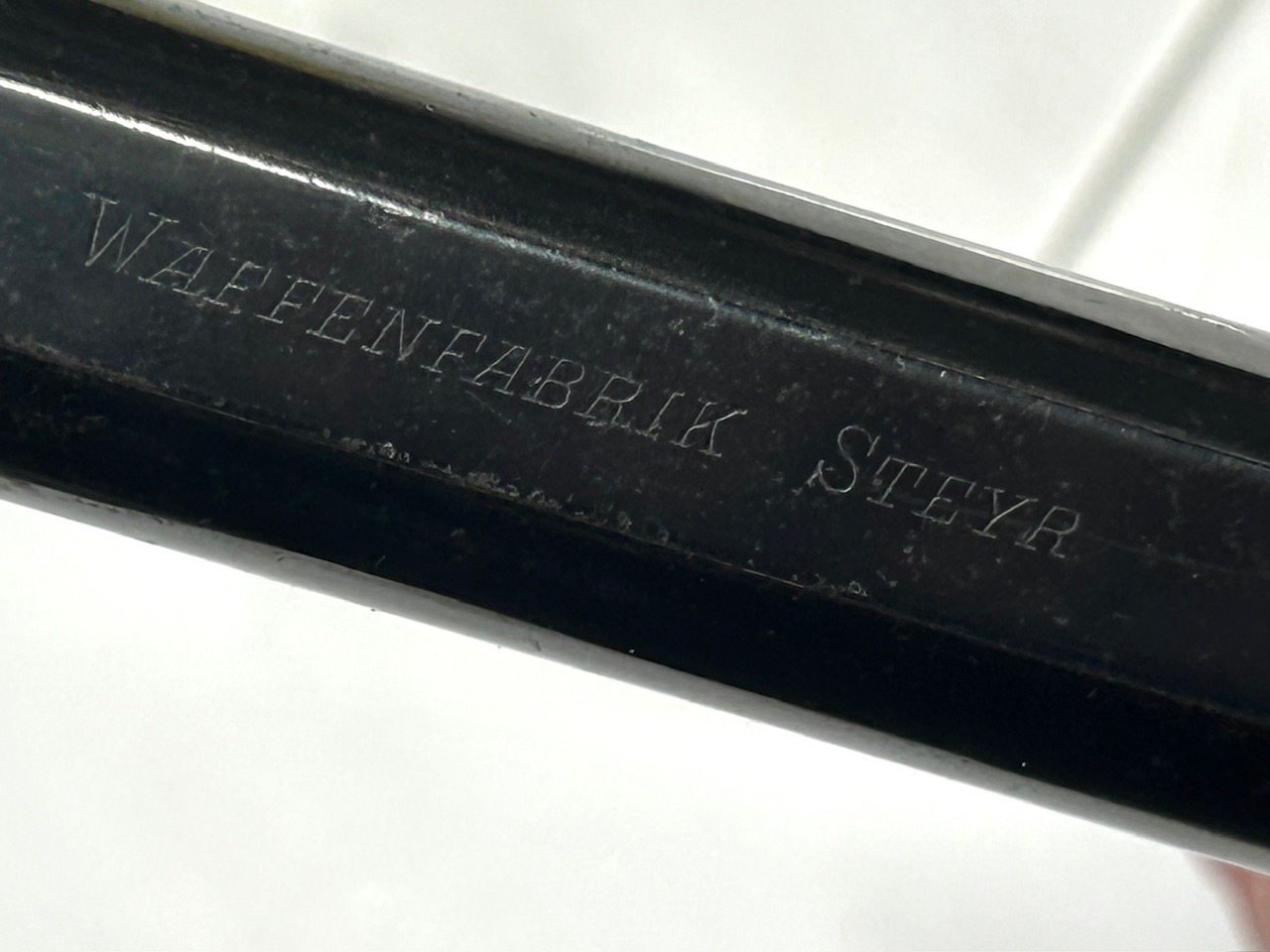 Fa parte della prima serie prodotta dalla WAFFENFABRIK STEYR , considerata la matricola a 3 numeri, che nascevano prive del disconnettore e quindi del relativo perno, ma che è stata modificate in arsenale con l’aggiunta del perno quando la modifica tecnica fu adottata nella produzione di serie. Banco di prova militare Vienna 1909. Condizioni eccellenti, la brunitura lucida è stata ripresa in tempi non recenti, essendo arma da ritrovamento priva di banchi moderni, nome del fabbricante ben visibile rullato sulla canna, guancette originali belle con dischetto di metallo marcato “IR 32 – 24” (32^ Infanterie Regiment, arma nr. 24) ; completa della rara lastrina di caricamento con cursore spingi cartucce.