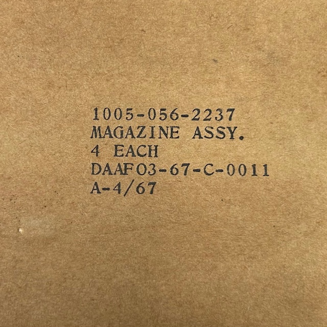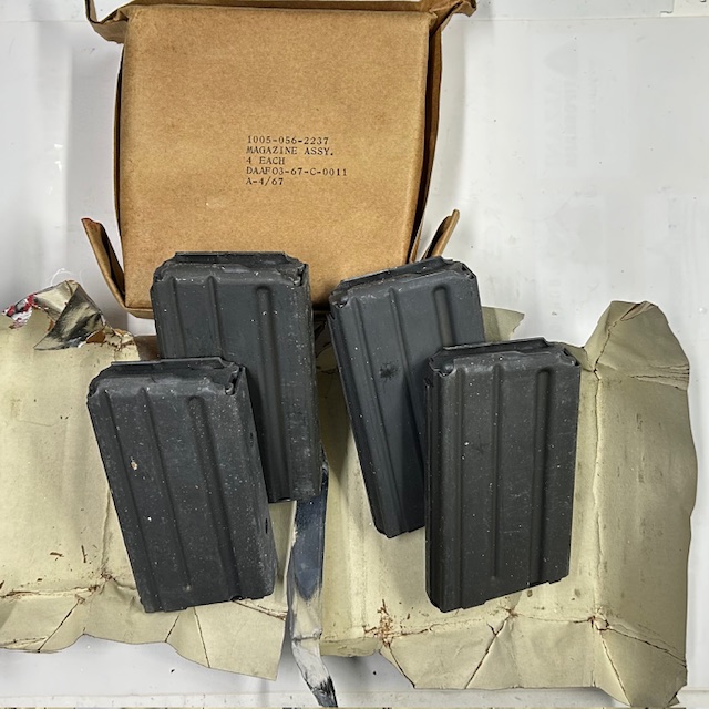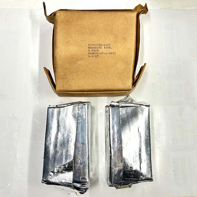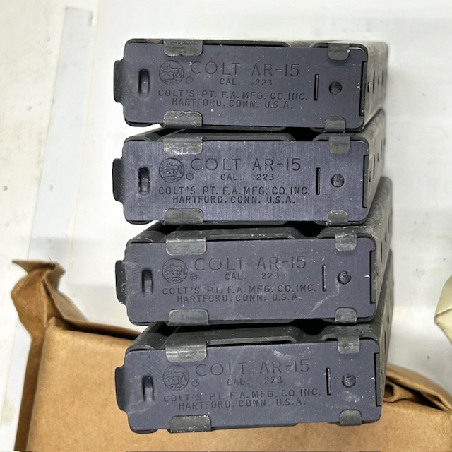 Raro set di 4 caricatori originali COLT da 20 colpi ancora nell’imballo originale datato Aprile 1967, per il fucile d’assalto M16A1 adottato nel febbraio dello stesso anno dalle truppe USA impiegate nel conflitto in Vietnam. Sul fondello sono marcati con il logo del cavallino e “COLT AR-15 Cal. 223 – COLT’S PT. F.A. MFG. CO. INC. – HARTFORD CONN. USA“, sono confezionati a coppia nella carta argentata e il masterpack da 4 ancora sigillato riporta la scritta