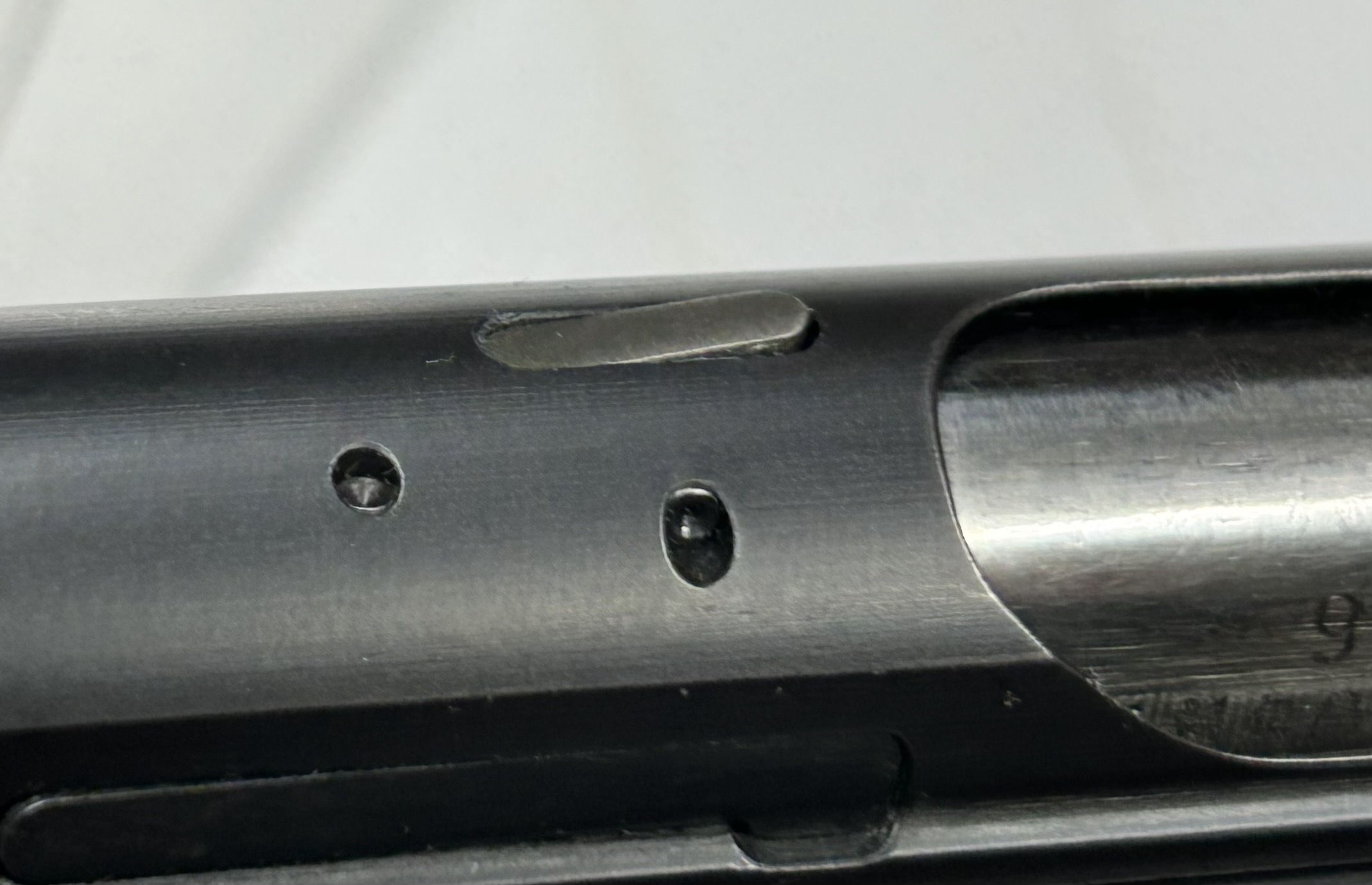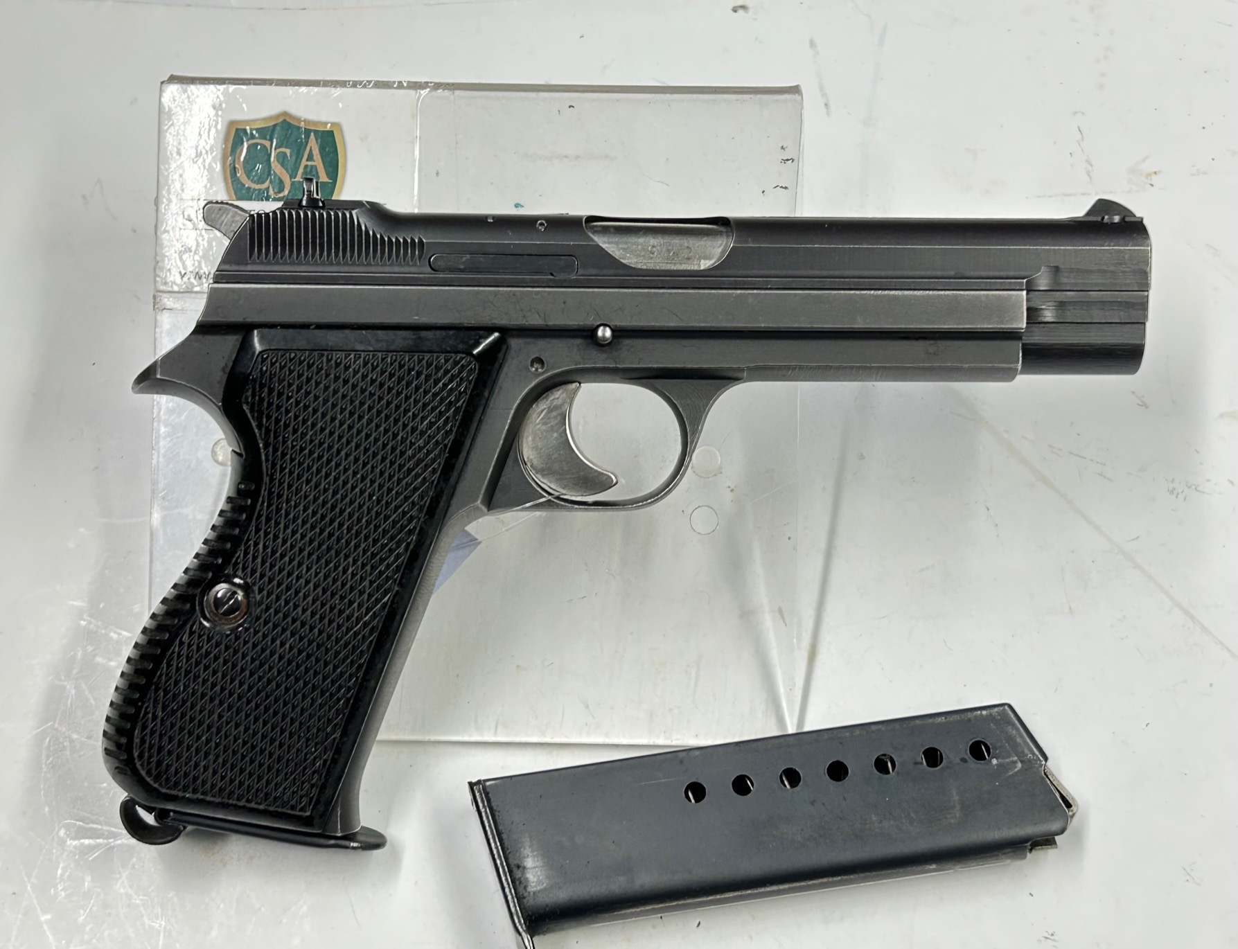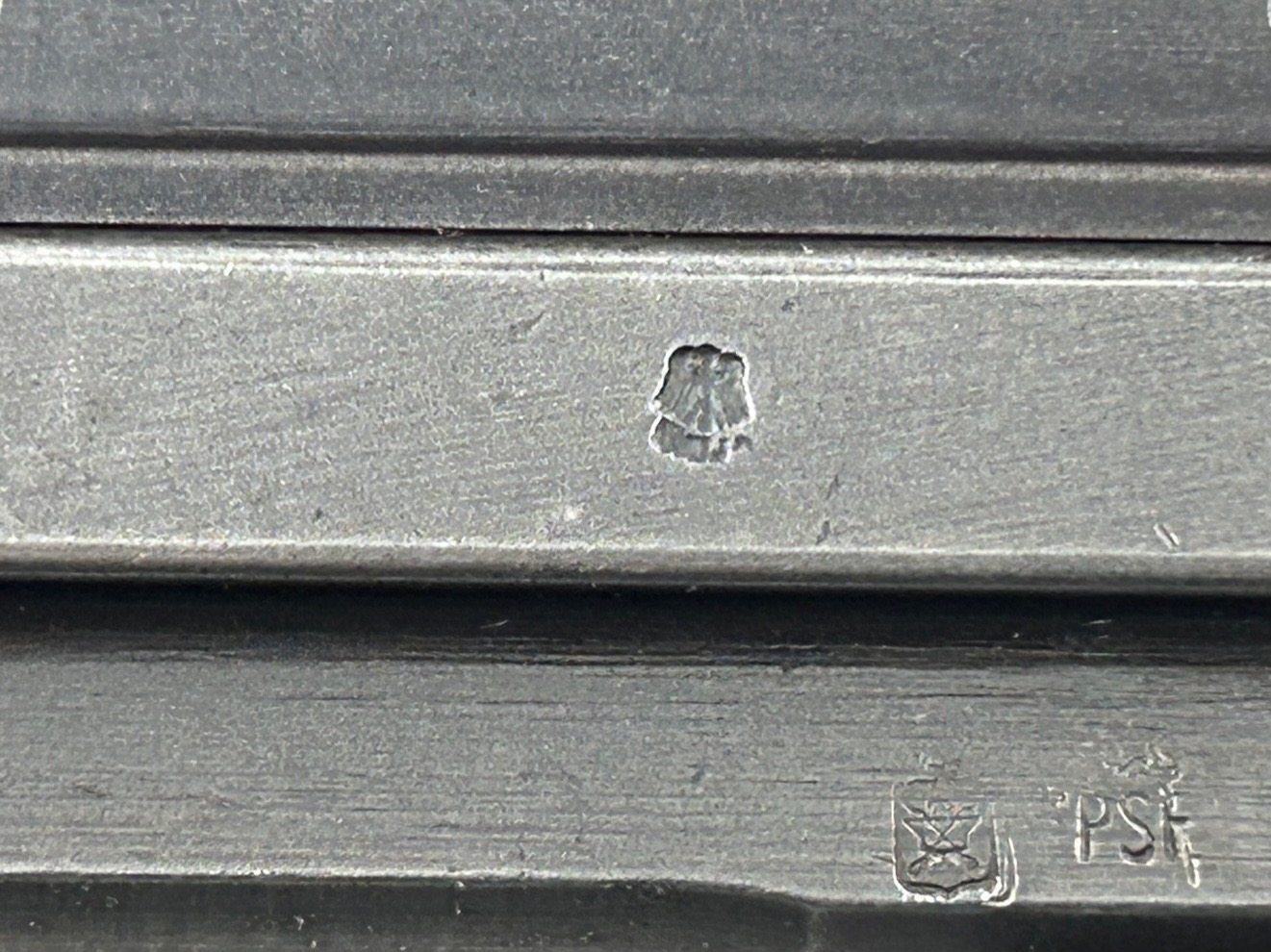 SIG prodotta nel 1951 per la BGS (BundesGrenzShutz), la neonata guardia di frontiera della Germania Ovest, che in ottemperanza alle limitazioni imposte dai trattati di pace non poteva approvvigionarsi di armi di fabbricazione tedesca, optando quindi per un ordine di 5000 pz della pistola appena adottata dall’esercito elvetico. Riconoscibili per la matricolazione da 1 a 5000 preceduta dalla lettera D (x Deutschland), per la presenza dell’avvisatore di colpo in canna e la mancanza dell’anello portacorreggiolo. Questo esemplare presenta anche i punzoni di accettazione aquila federale con un numero (cd. WaffenAmt) . Condizioni originali eccellenti, piccoli segni di fondina sugli spigoli, tipica finitura opaca “dual tone” del periodo, canna e meccanica perfette, guancette originali. Arma importata nel 2000 con calibro modificato per adeguarsi alla normativa dell’epoca.