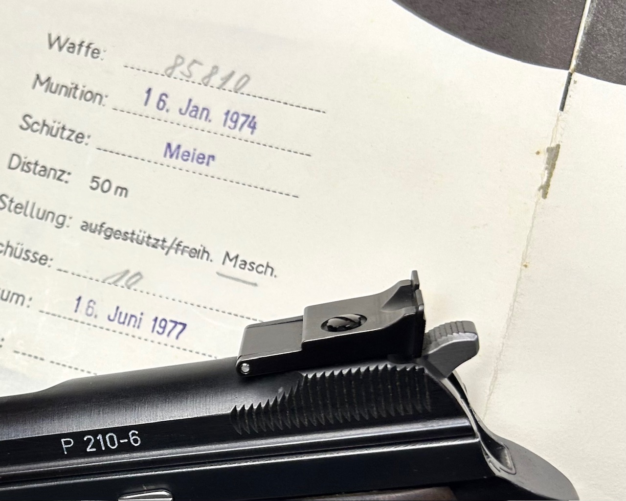 Versione sportiva della mitica P210 con canna 120 mm, tacca di mira regolabile micrometricamente, scatto alleggerito fissato con vite sotto l’elsa, matricola 5 numeri, bersaglio prova di fabbrica a 50 mt (!) datato 16. Juni 1977 , finitura opaca originale in condizioni splendide, canna specchio, meccanica perfetta, monta le guancette in legno originali che erano fornite su ordinazione (standard erano in plastica nera), carichino SIG, completa di scatola e manuale originali.