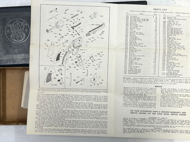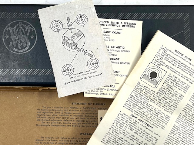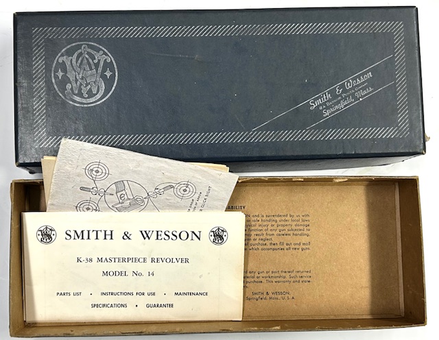 Dotazione originale per un revolver Smith & Wesson 14-3, con la tipica scatola anni 60 in cartone blu con bordi rinforzati in metallo, manuale originale a 4 pagine, istruzioni tacca di mira e documenti garanzia. Condizioni eccellenti con normali segni di utilizzo.