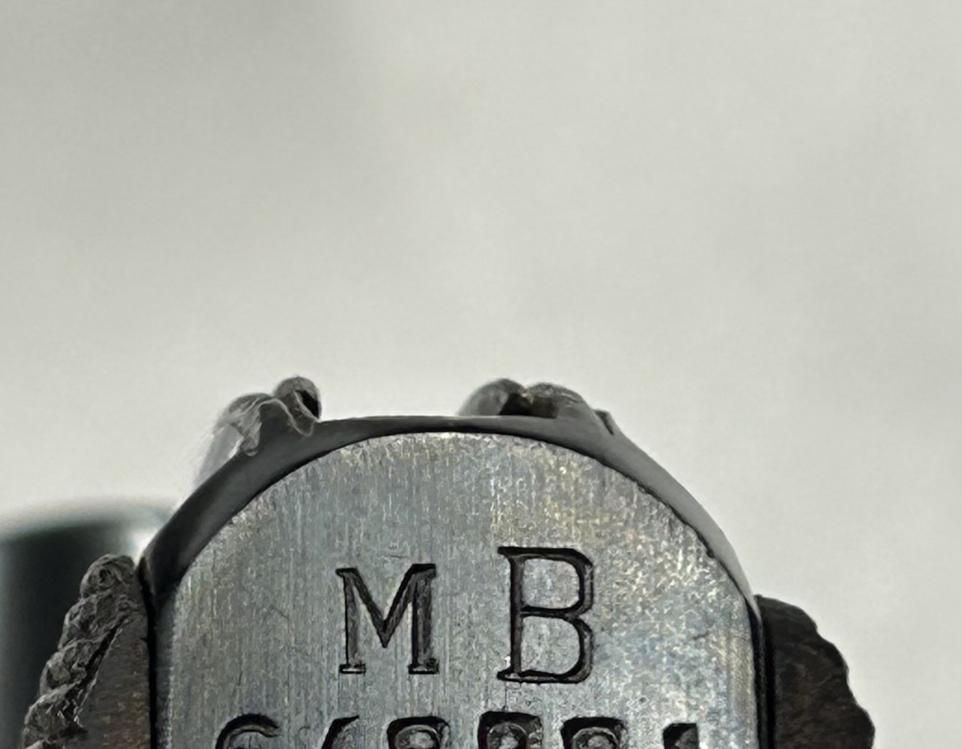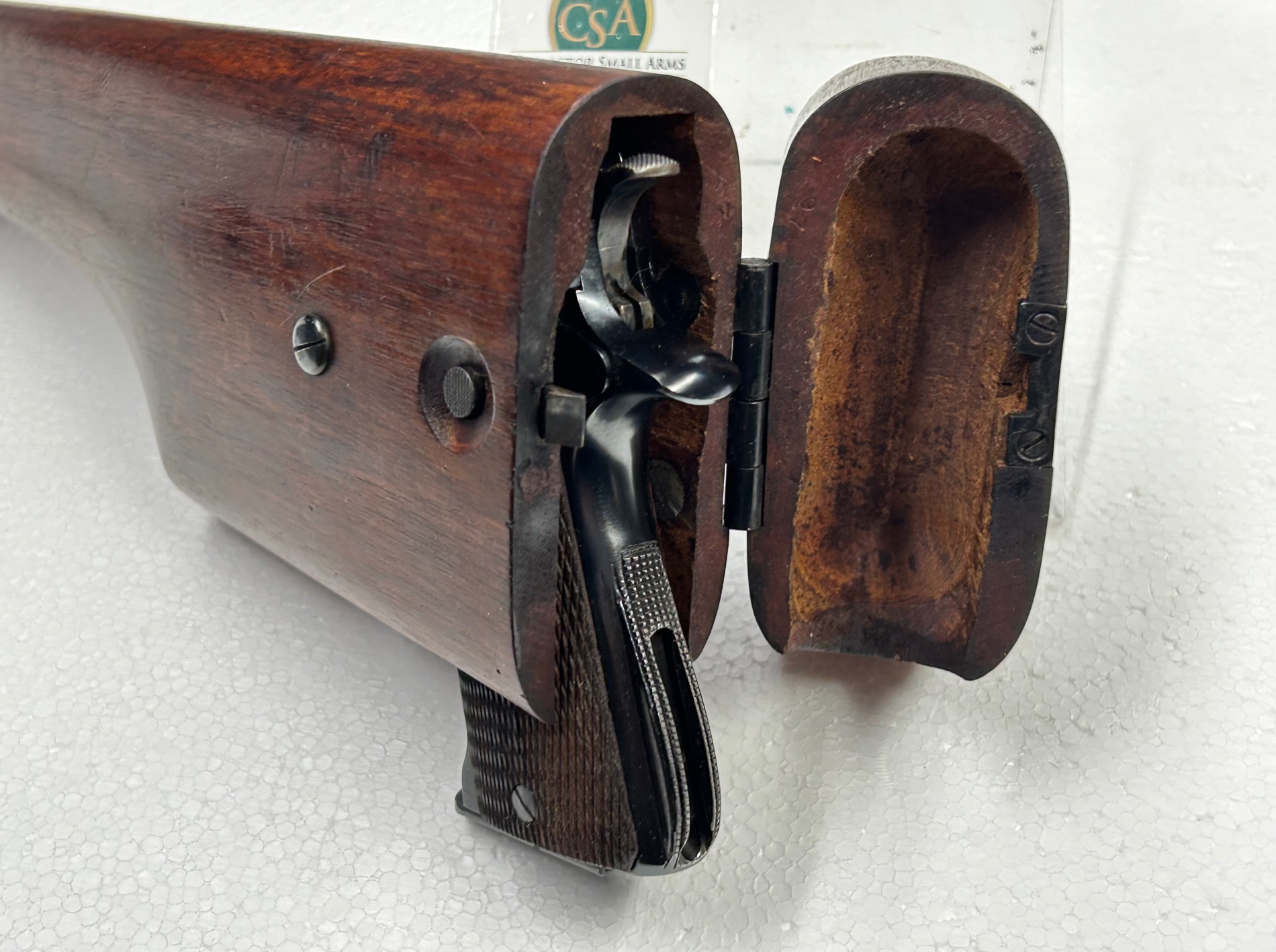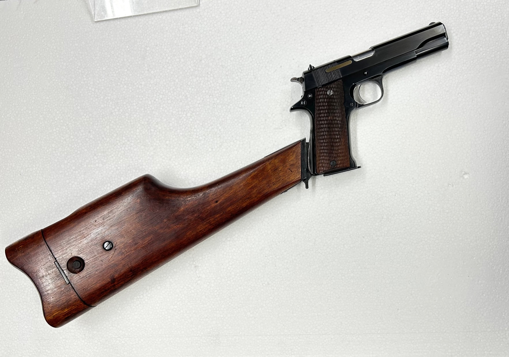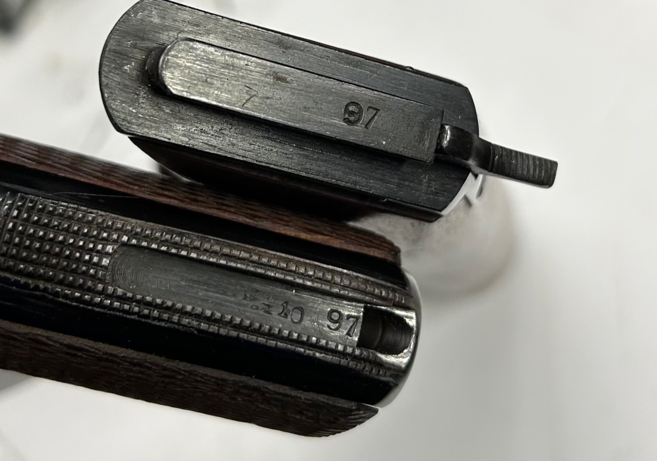 Condizioni splendide di brunitura originale, canna e meccanica perfette, così come il calciolo che è nato con l’arma come testimonia il numero di assemblaggio riportato anche sulla slitta nel dorso della pistola; guancette in noce originali che erano opzionali rispetto a quelle standard in bakelite rossiccia.