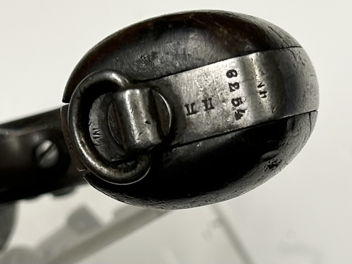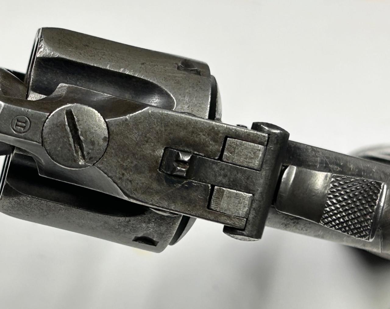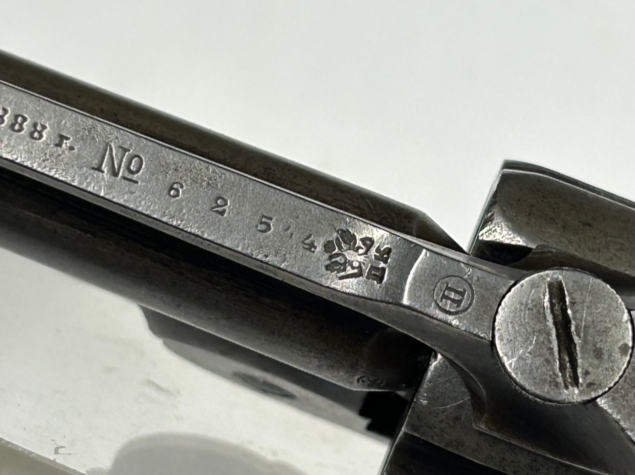 Ex ordinanza destinata agli ufficiali dell’Esercito Imperiale Russo, si tratta di una Smith & Wesson Third Model, prodotta dall’Arsenale Imperiale di TULA con impresso l’anno 1888 sulla canna, preceduto dal nome della fabbrica in cirillico e seguito da matricola e punzone di accettazione dell’esercito russo, rappresentato dall’aquila dei Romanov e dalle lettere in cirillico “PK” per Prijomnaja Komissija = Commissione di accettazione, ripetuto anche sul fusto.