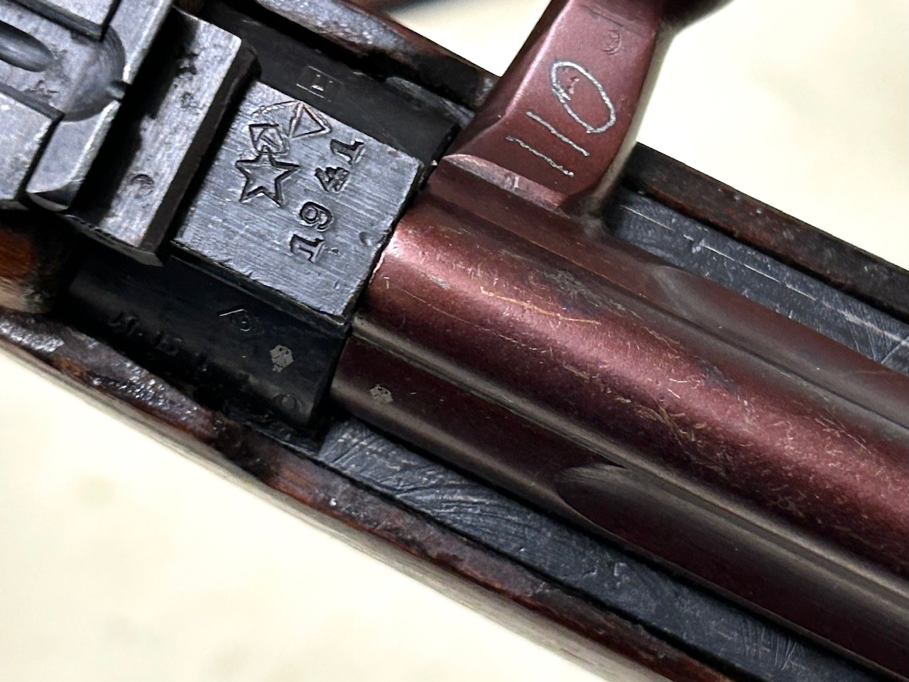 Anno 1941, produzione arsenale di TULA (punzone della stella a 5 punte), ferri e legni in condizioni eccellenti, canna molto bella, punzoni originali d’arsenale sulla culatta, calcio monomatricola, Completo di cinghia originale primo tipo, 4 lastrine di caricamento e la rara baionetta originale con il suo fodero metallico.