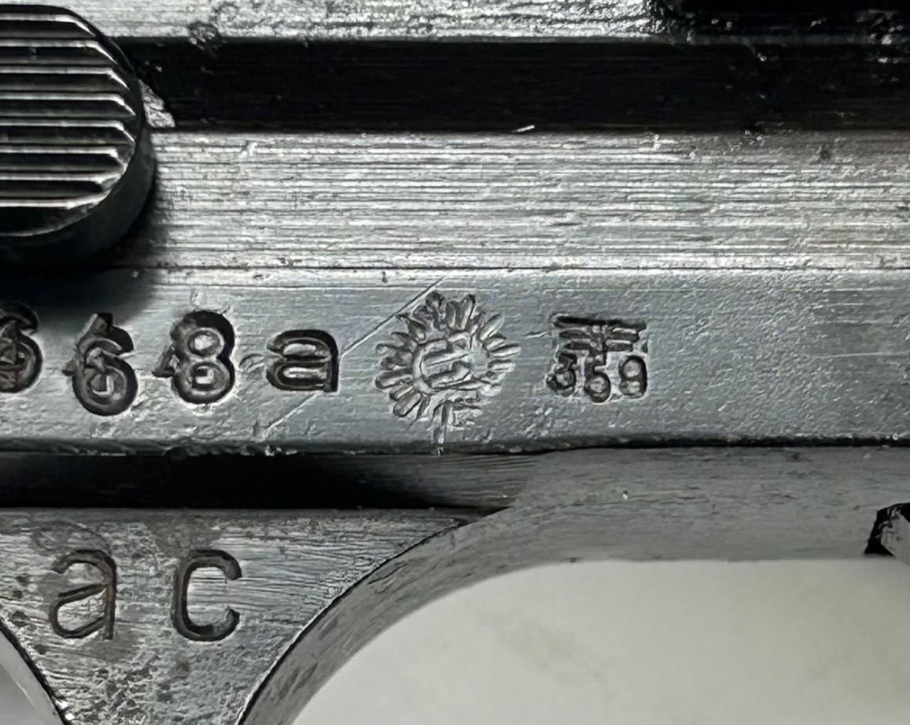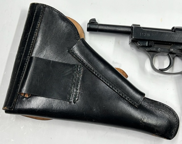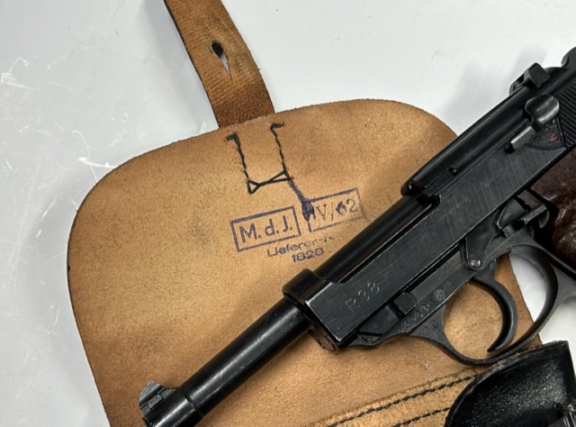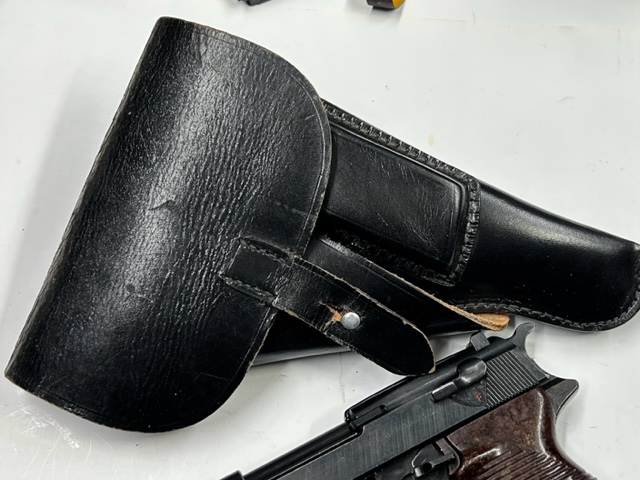 P38 di produzione Walther anno 1944, sul carrello “P.38” e “ac-44”, sul lato dx il punzone di prova e del WaffenAmt “aquila-359” presente anche su fusto, canna e alcuni componenti, più il punzone di uno scudo con il numero “11”, all’interno di un sole, che testimonia l’utilizzo da parte della VoPo, la VolksPolizei della DDR negli anni 50-60. In particolare si tratta di dotazione degli agenti di sicurezza del Ministero di Giustizia, il cui marchio “M.d.J.” in un quadrato (Ministerium der Justiz) è stampato sulla fondina originale in cuoio nero datata 1962. Monomatricola con fusto rinumerato in arsenale come avveniva sovente negli arsenali DDR dove con ogni probabilità è stata rinfrescata la brunitura, condizioni eccellenti , canna bella con rigatura 80%, guancette originali in bakelite rosso-marrone correttamente marcate, caricatore d’epoca.