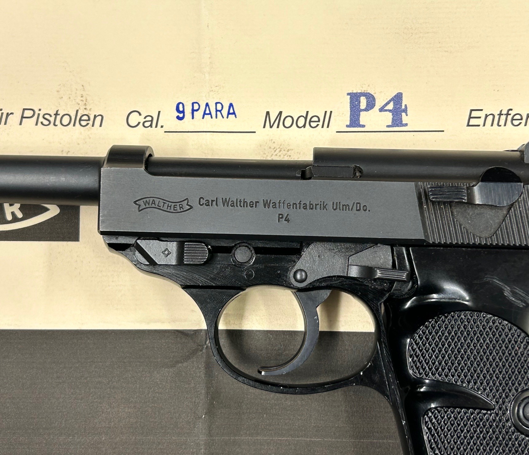 Arma sviluppata dalla Walther per le forze di polizia della Germania Ovest, di fatto un raro modello di transizione tra la P1/P38 e la P5 che verrà prodotta invece in grandi quantità: la produzione della P4 inizia nel 1975 con la matricola 600001 e in una decina d’anni vengono prodotte meno di 7000 P4, di cui circa 6mila destinate al Ministero dell’Interno (polizia di frontiera e dogana), rendendo le versioni commerciali come questa una vera rarità.