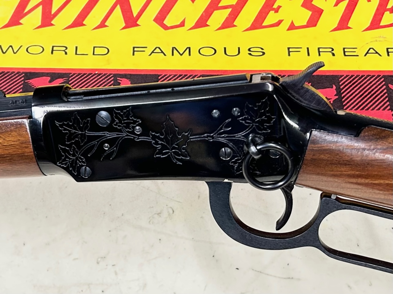 Edizione speciale realizzata nel 1967 in quantità limitata per celebrare il centenario del Canada, condizioni pari al nuovo con scatola originale, manuale e documenti; costruito sulla meccanica 1894 presenta una canna ottagonale pesante da 20″ con incisione dorata “Canadian Centennial 1867-1967“, sulle cartelle laterali incisioni con foglie d’acero, simbolo nazionale, 5 per lato a simboleggiare le 10 province della Confederazione Canadese e una più grande rappresenta i territori del nord; come versione “carbine” ha correttamente sul lato sx il “saddle ring”.
